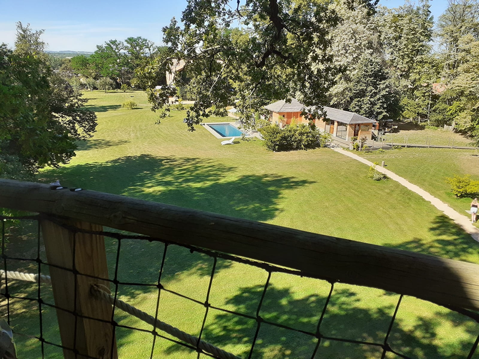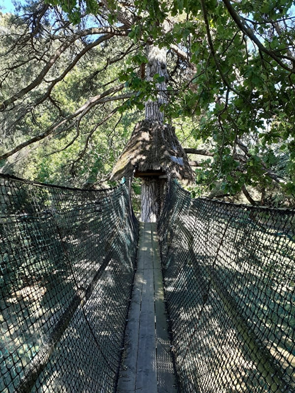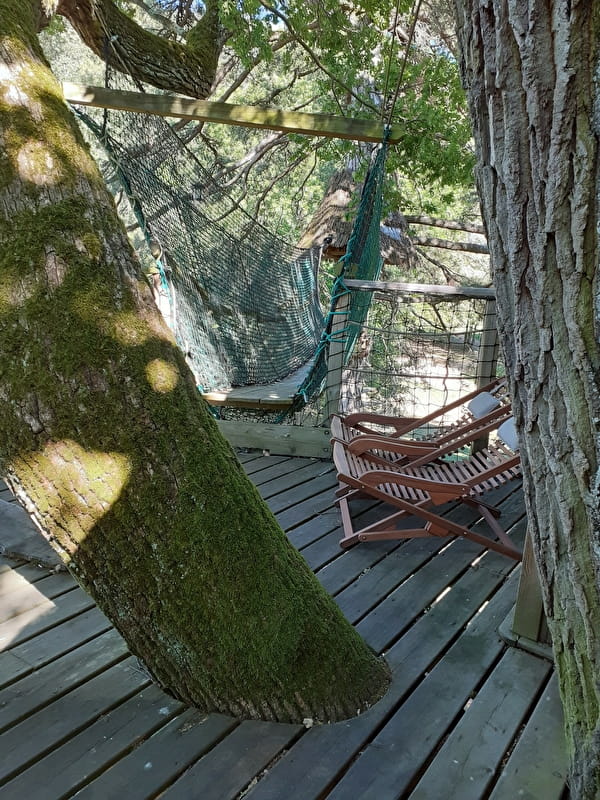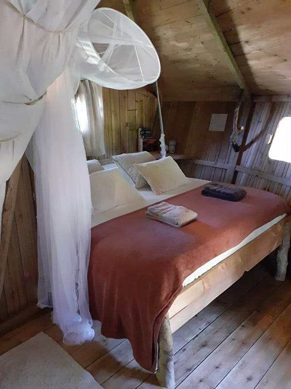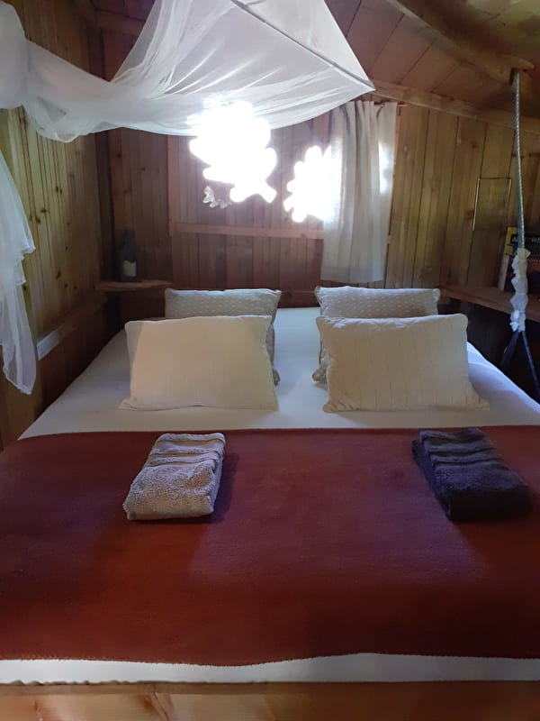 Cette cabane peut accueillir 2 personnes. Elle contient un lit double et une terrasse donnant sur le parc. Disposée à 9 mètres de hauteur, elle est idéale pour les amoureux d’aventure tout en restant extrêmement sécurisée avec des portillons, des rambardes et des filets. Elle accepte donc les enfants à partir de 12 ans.