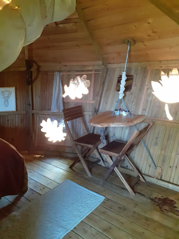 La cabane est située à environ 50 mètres de l’espace sanitaire avec cabines douches et toilettes privatifs.