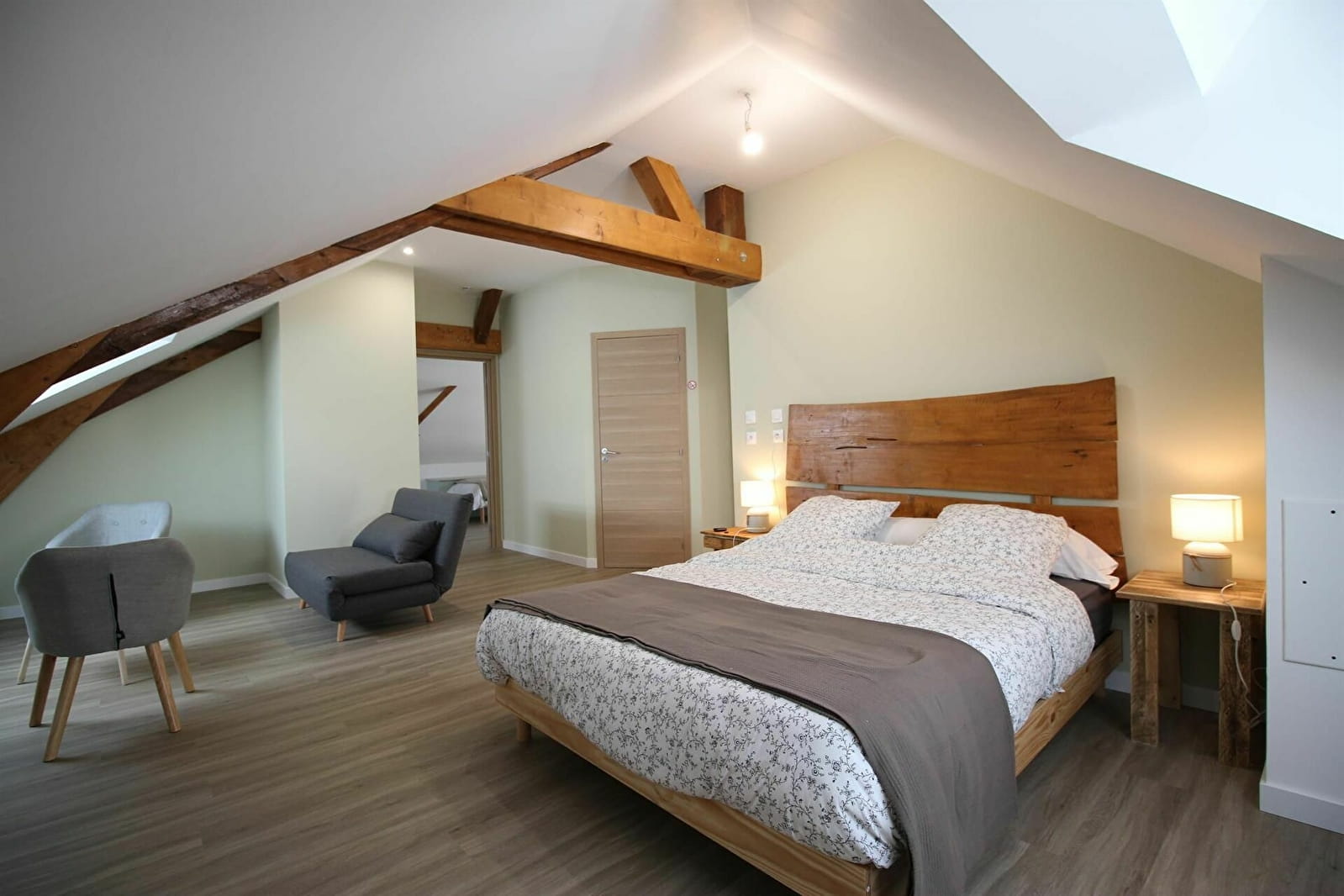 Au deuxième étage, la Suite Parentale, pouvant accueillir 4 personnes, un lit de 160*200cm, deux lits de 90*190cm et un lit bébé. Un espace salon, une salle d'eau et WC séparés.