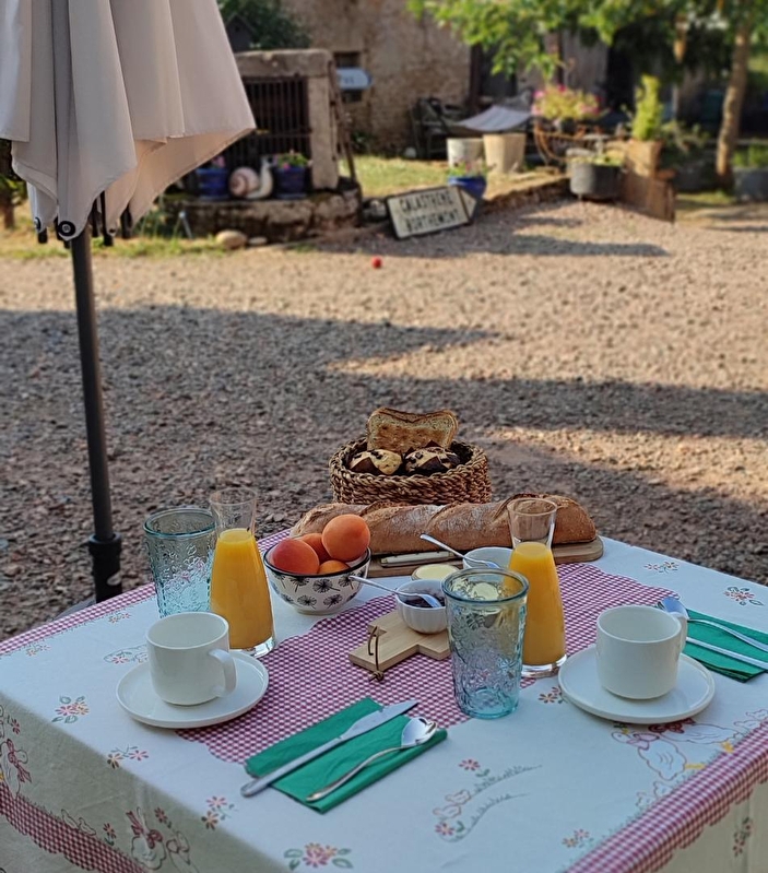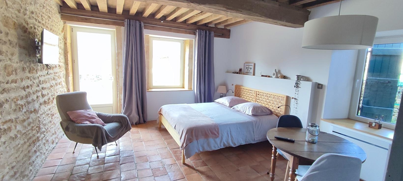 Composition : Chambre au rdc de la maison des propriétaires sur une propriété abritant une mini ferme auberge (20 couverts). Wifi (fibre). Chauffage PAC. Chambre double avec TV (lit 2 p. 160x200cm). Salle d'eau privée "ouverte" sur la chambre (douche + Wc). Terrasse privée "sur cour" (en gravier). Petit déjeuner servi dans la pièce de vie adjacente des propriétaires ou sur terrasse aux beaux jours. Cour close avec jardinet + terrasses. Parking privé. Supérette 6 km. Restaurants & supermarchés 11 km.