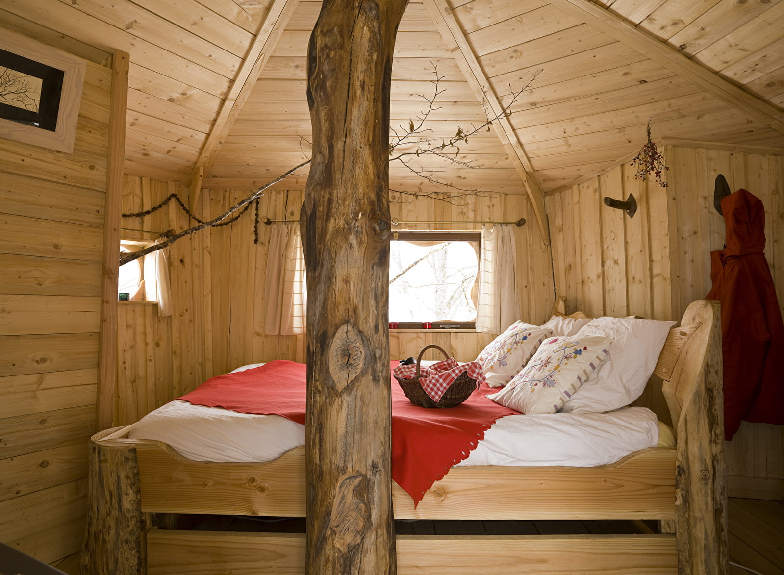 En poussant la porte de cette cabane posée dans les arbres, on peut voir que dame nature a su garder sa place , enveloppant de branches ce cocon, en préservant l’intimité des habitants de passage, au fil des saisons.