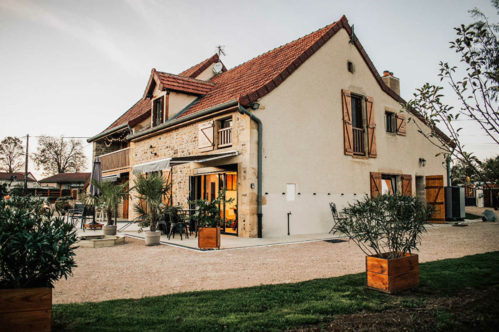 Ravissante ferme traditionnelle brionnaise du 19ème siècle, soigneusement restaurée dans les règles de l’art, nichée en pleine campagne en lisière de pâtures, avec les vaches charolaises comme paisibles voisines. Calme & totale tranquillité au sein d’un petit hameau rural, au creux d’un sublime écrin de verdure & nature, non loin du pittoresque village de Vareilles. Blotti sur les premiers contreforts des Monts du Beaujolais, ce charmant bourg préservé dispose d’un patrimoine notable (églises romane classée du XIe, belles demeures typiques à colombages…) et profite d’un magnifique cadre paysagé, succession de bucoliques bocages vallonnés, étangs, rivières & forêts. Chambre de très bon confort lovée sous les toits. Beau volume. Chaleureux cachet campagnard d’esprit contemporain sublimée par les riches traces du bâti (murs en pierres, linteaux de fenêtres en pierres & bois et poutres d’époque parfaitement conservées). Ambiance cocooning, douillette & cosy. Belle vue dégagée sur la montagne de Dun (point culminant du Brionnais), le Mont Saint-Cyr & le Mont Saint Rigaud (point culminant du Beaujolais). Belle pièce de vie bien équipée 100% privative doté d’un coin salon avec TV. Agréable spacieuse terrasse privative exposée au sud, ouverte sur les prés en mode « carte postale ». Superbe propriété close de 2300m² - littéralement « tirée au cordeau » tel un parc paysagé - soigneusement fleurie, engazonnée, végétalisée, arborée (pruniers, pommiers, pêches de vignes, raisin etc…) comprenant le jardin potager propriétaires.
