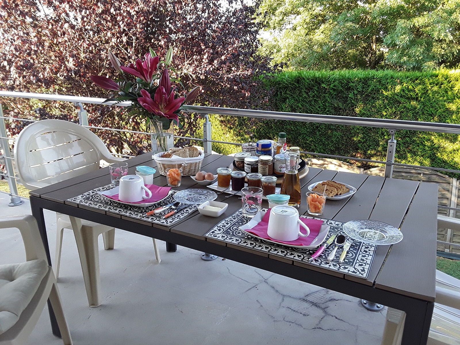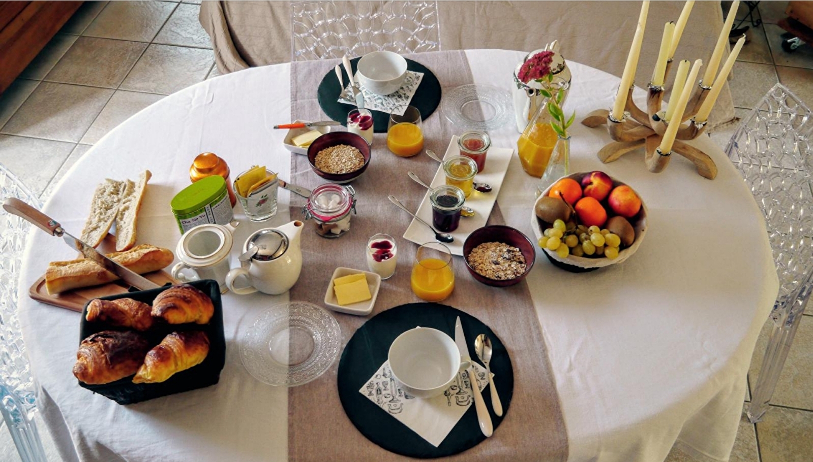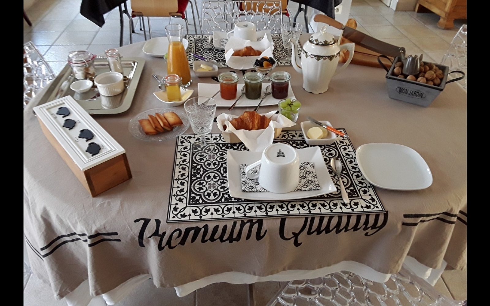 Le petit déjeuner gourmand, composé de produits frais et locaux, est servi dans la salle à manger, l'hiver au coin du poêle à bois et sur la terrasse l'été avec vue dégagée sur les monts de l'Auxois.