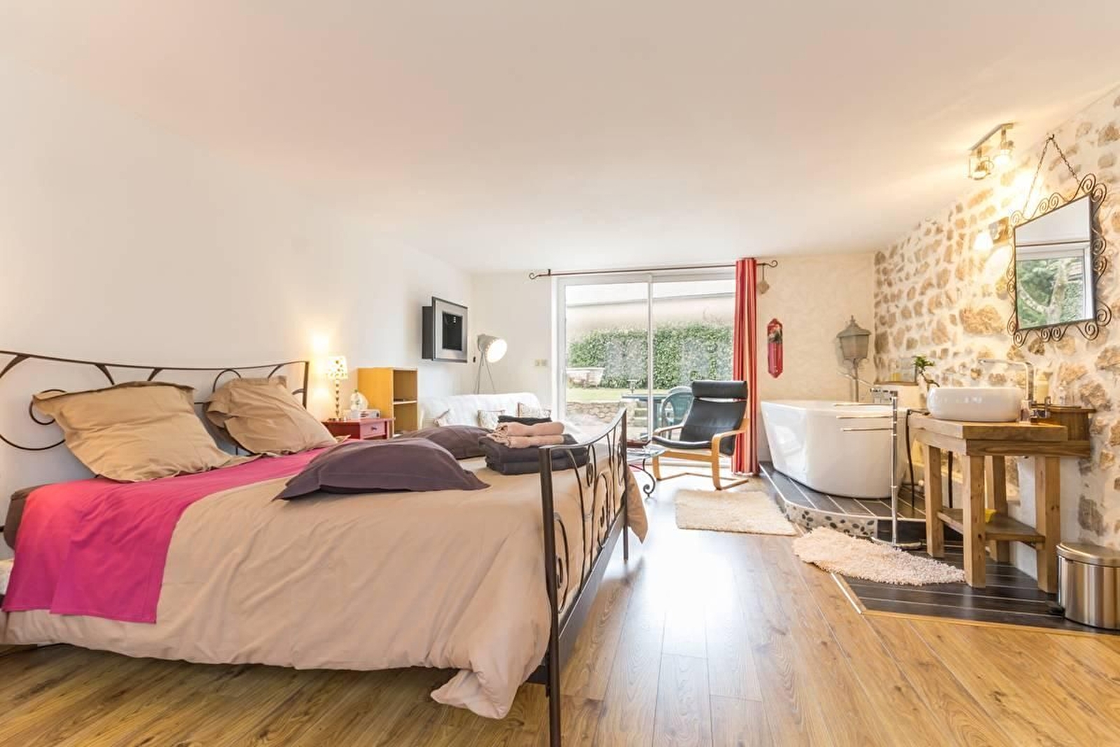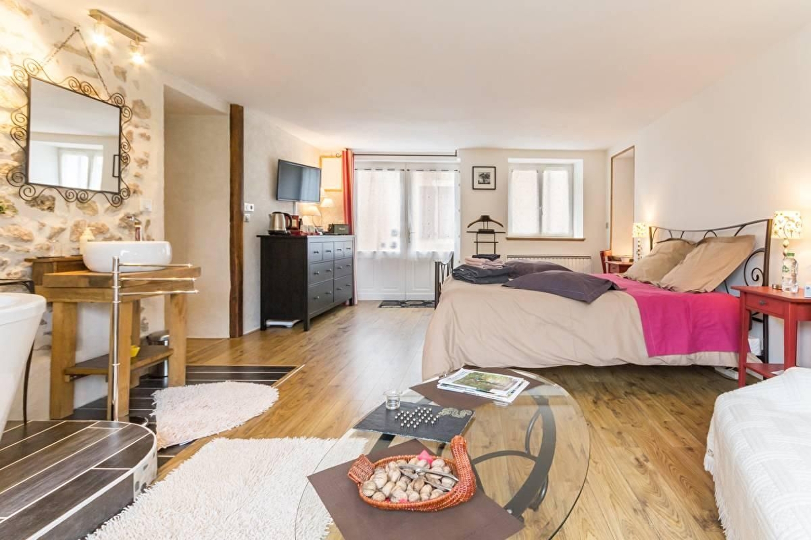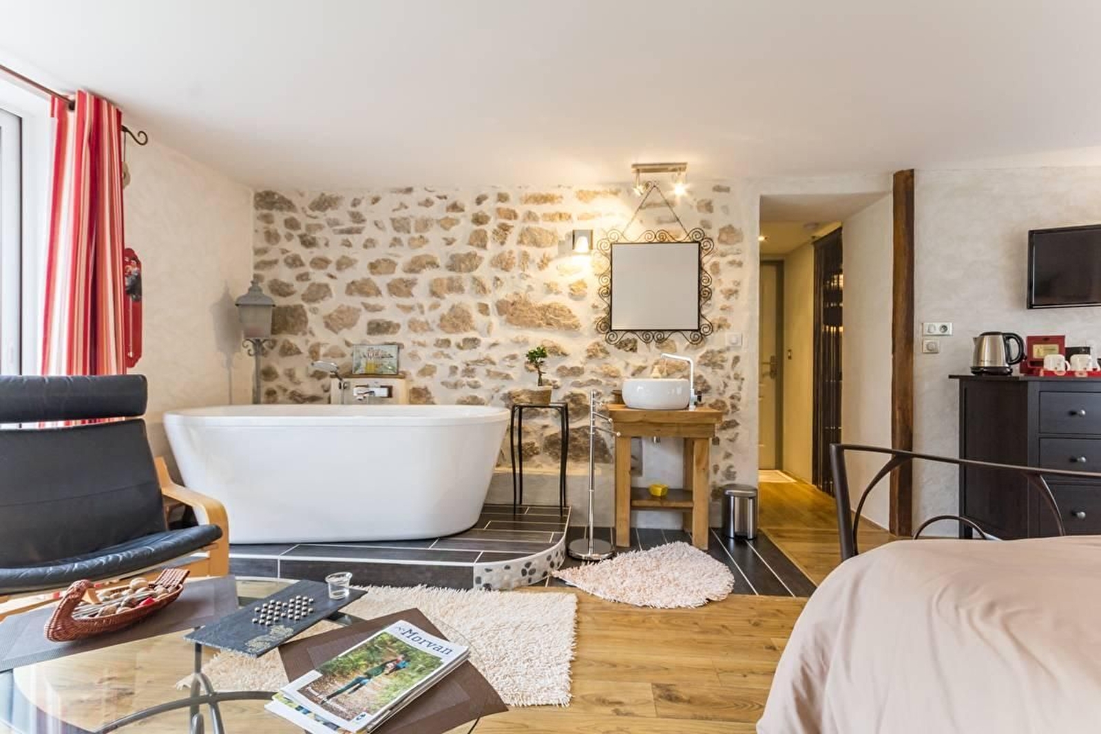 Venez séjourner au calme dans une suite moderne et parfaitement équipée située en rez-de-chaussée avec entrée indépendante et accès direct à la terrasse et au jardin. La suite est équipée d'un lit 160x200, télé connectée incluant Netflix, lecteur dvd, chaîne hifi, console de jeu wii, wifi, plateau de courtoisie. Salle de bain originale puisqu'ouverte dans la chambre, sans oublier le coin salon, un dressing, wc indépendant et kitchenette. Située au coeur de la région des lacs du Morvan, à partir de la chambre, de nombreuses ballades vous attendent ainsi que la proximité de lacs et rivières et notamment chemins de randonnée menant à la chapelle du Banquet. Parking.
