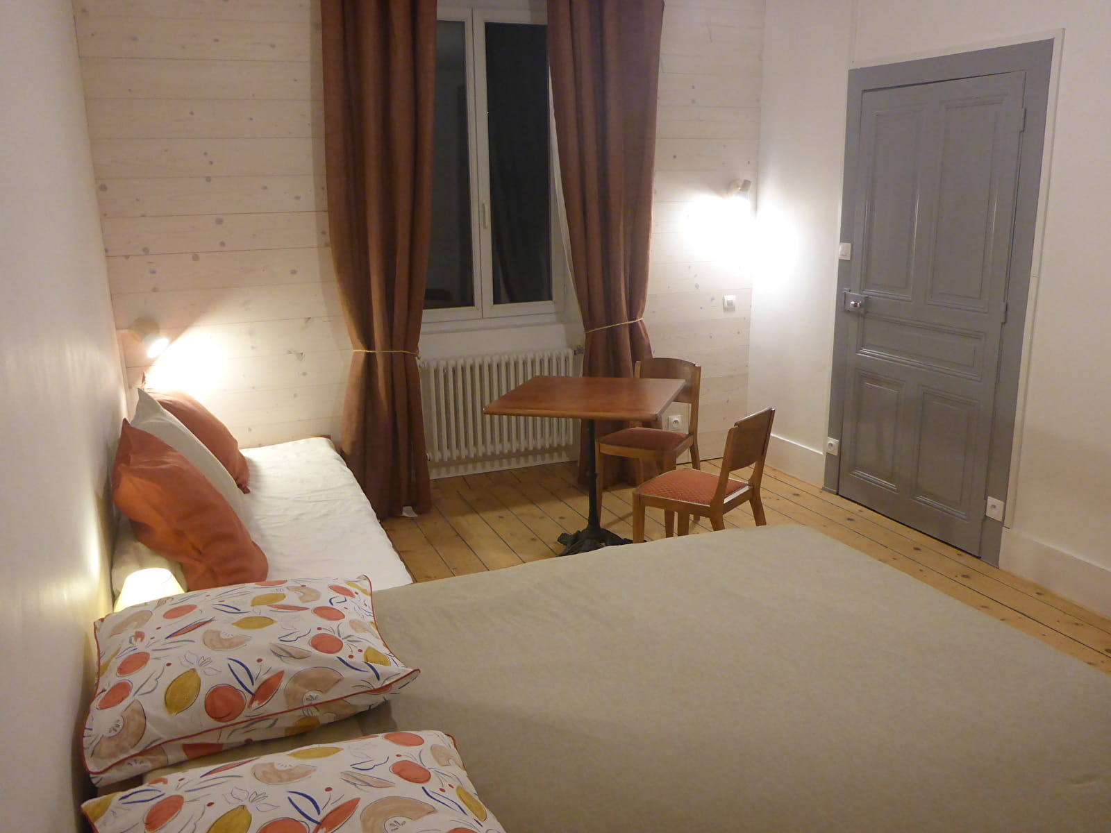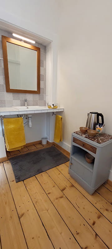 • 1 chambre d'hôtes pour 2 à 4 personnes avec un lit de 160 et 2 lits en gigogne de 80, sanitaires et WC séparés privatifs. Literie complète, serviettes de bain, une bouilloire.