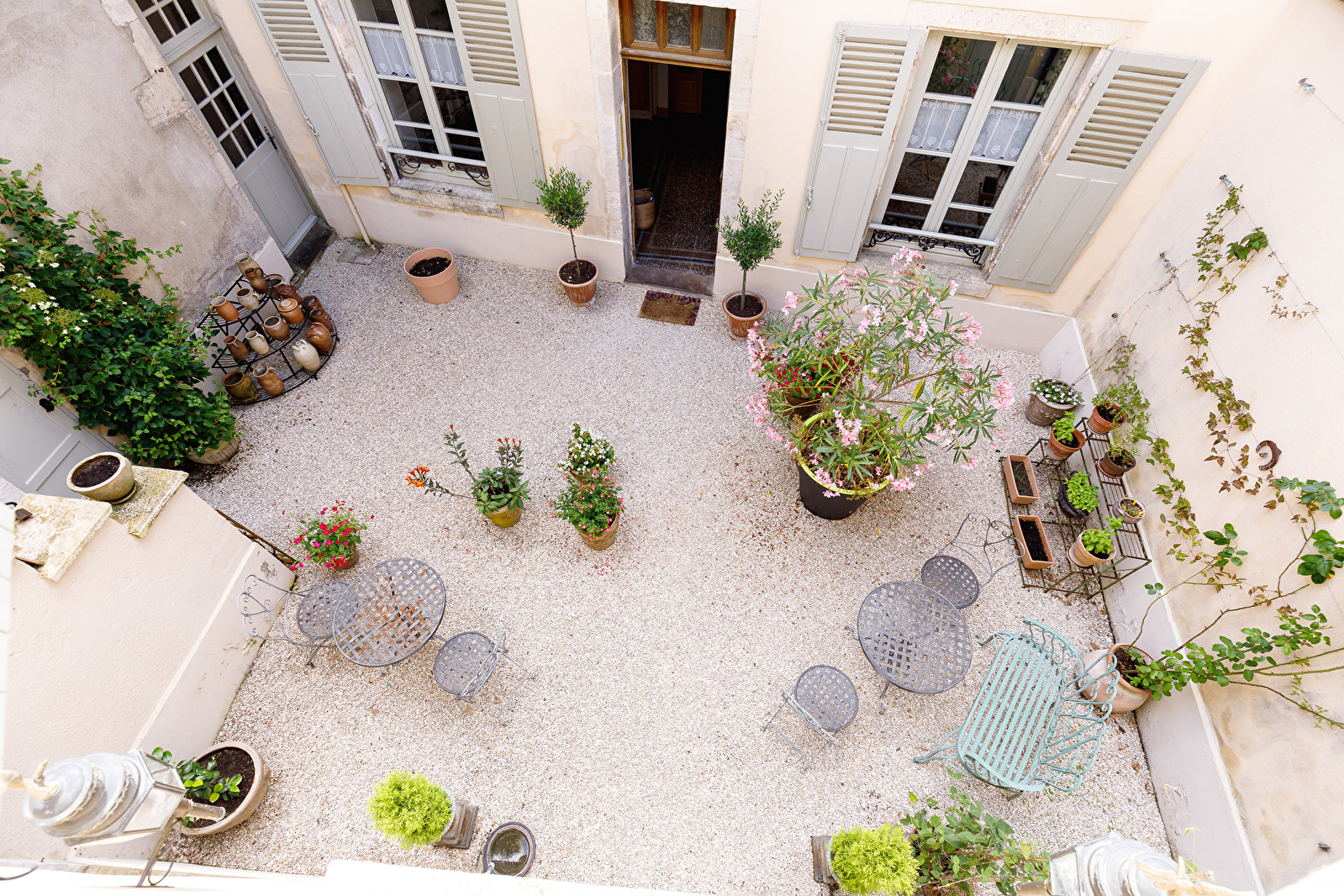À l’extérieur, vous pourrez vous détendre dans le jardin fleuri de la maison, ou profiter de la fraîcheur de la cour privée, un lieu charmant pour savourer un verre en soirée.