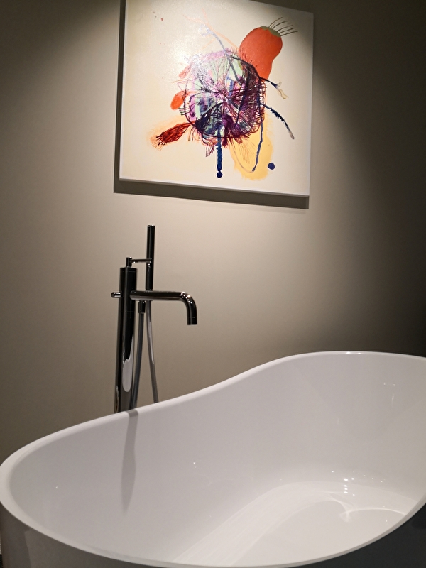 tonalites, le choix des matériaux, sobres esthétiques et fonctionnels, sa grande salle de bain disposant d'une baignoire îlot et d'une douche,