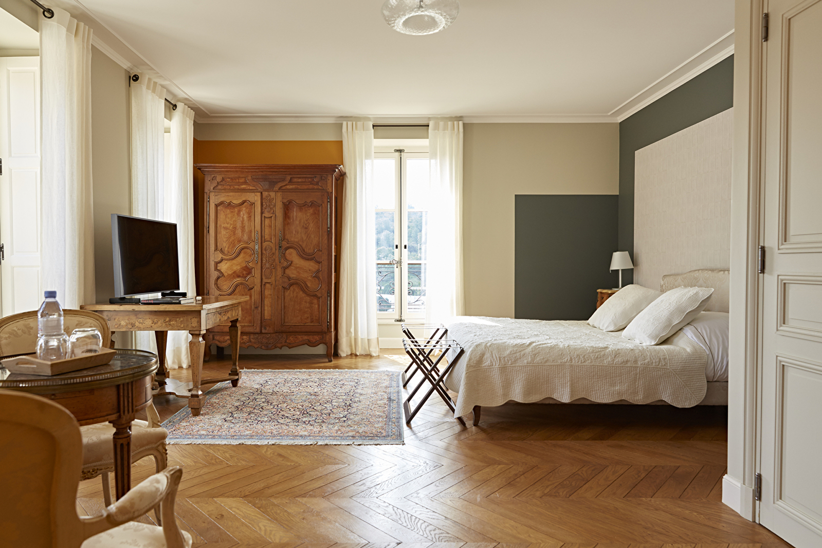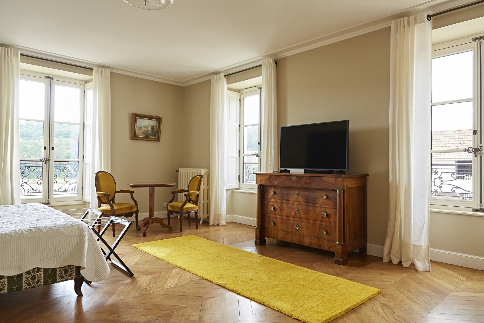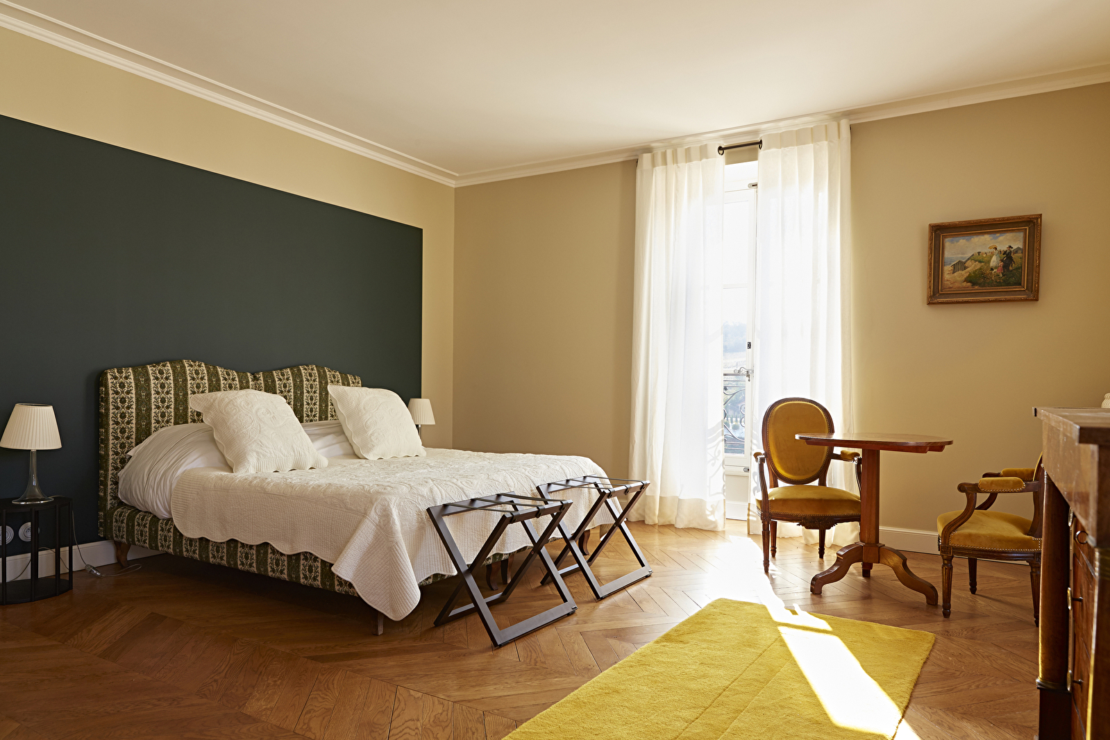 Au premier étage du château de Saint-Aubin, la chambre Le Clos s’ouvre en grand sur le vignoble du domaine et la mosaïque des Climats du vignoble de Bourgogne classés au patrimoine mondial de l’UNESCO.