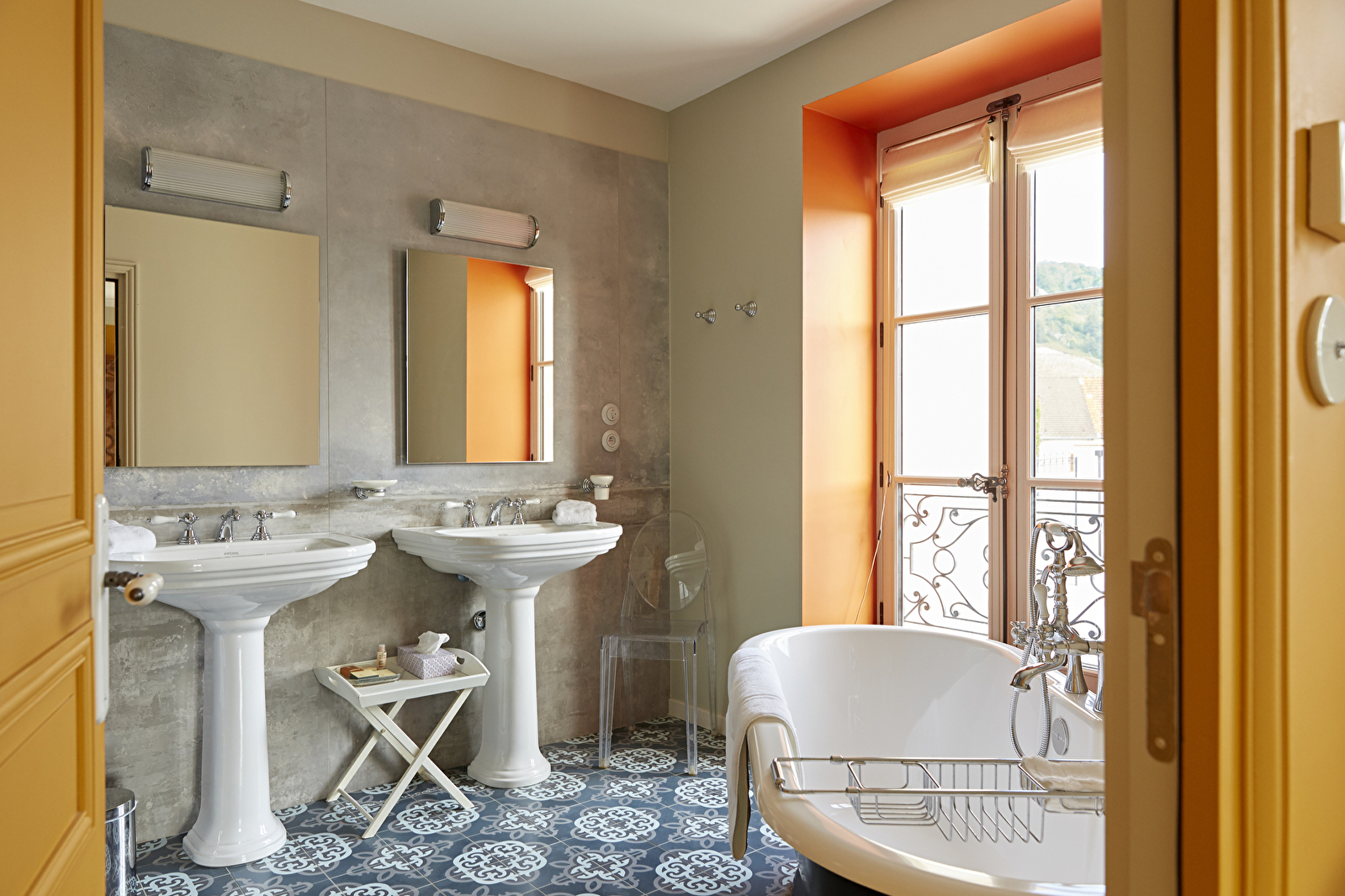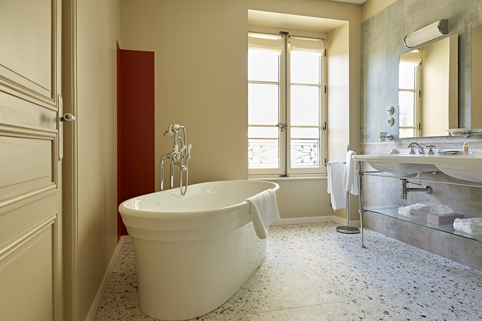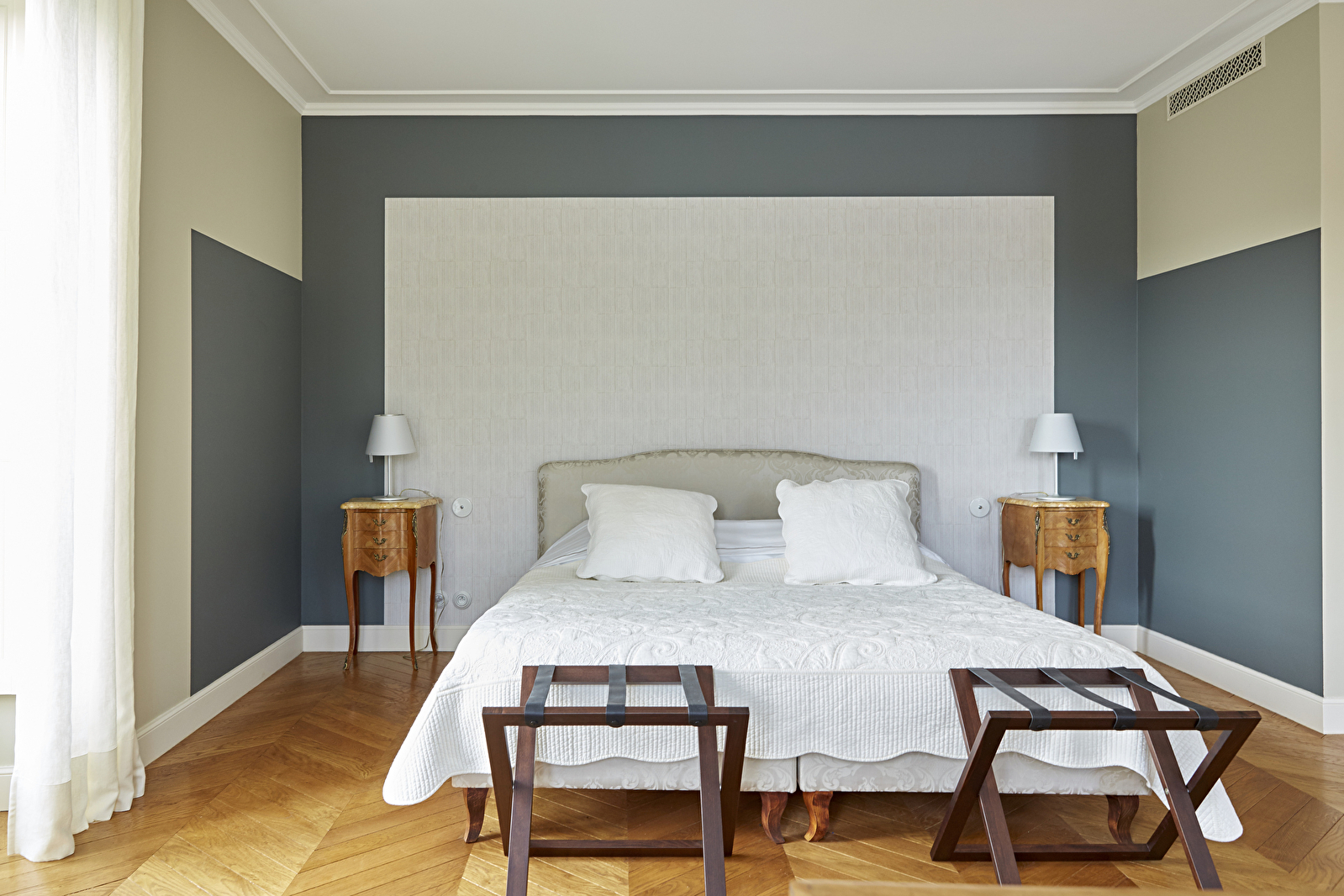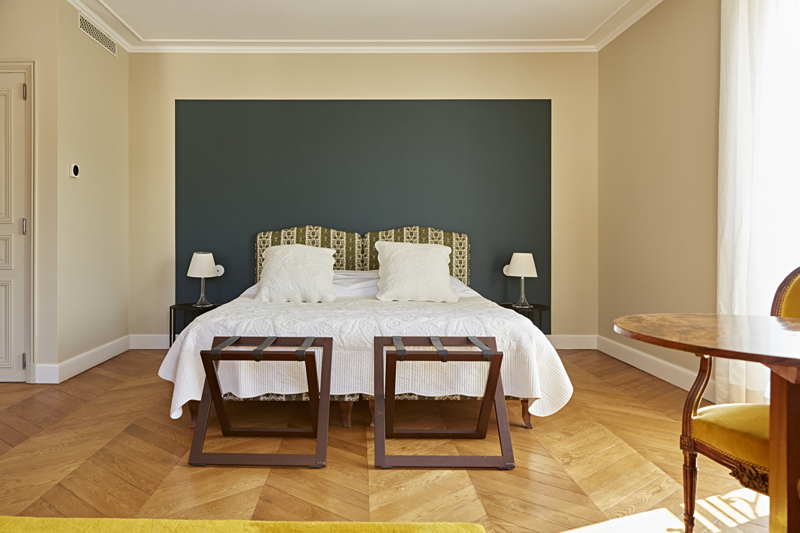 Au premier étage du château de Saint-Aubin, la chambre Le Clos s’ouvre en grand sur le vignoble du domaine et la mosaïque des Climats du vignoble de Bourgogne classés au patrimoine mondial de l’UNESCO.