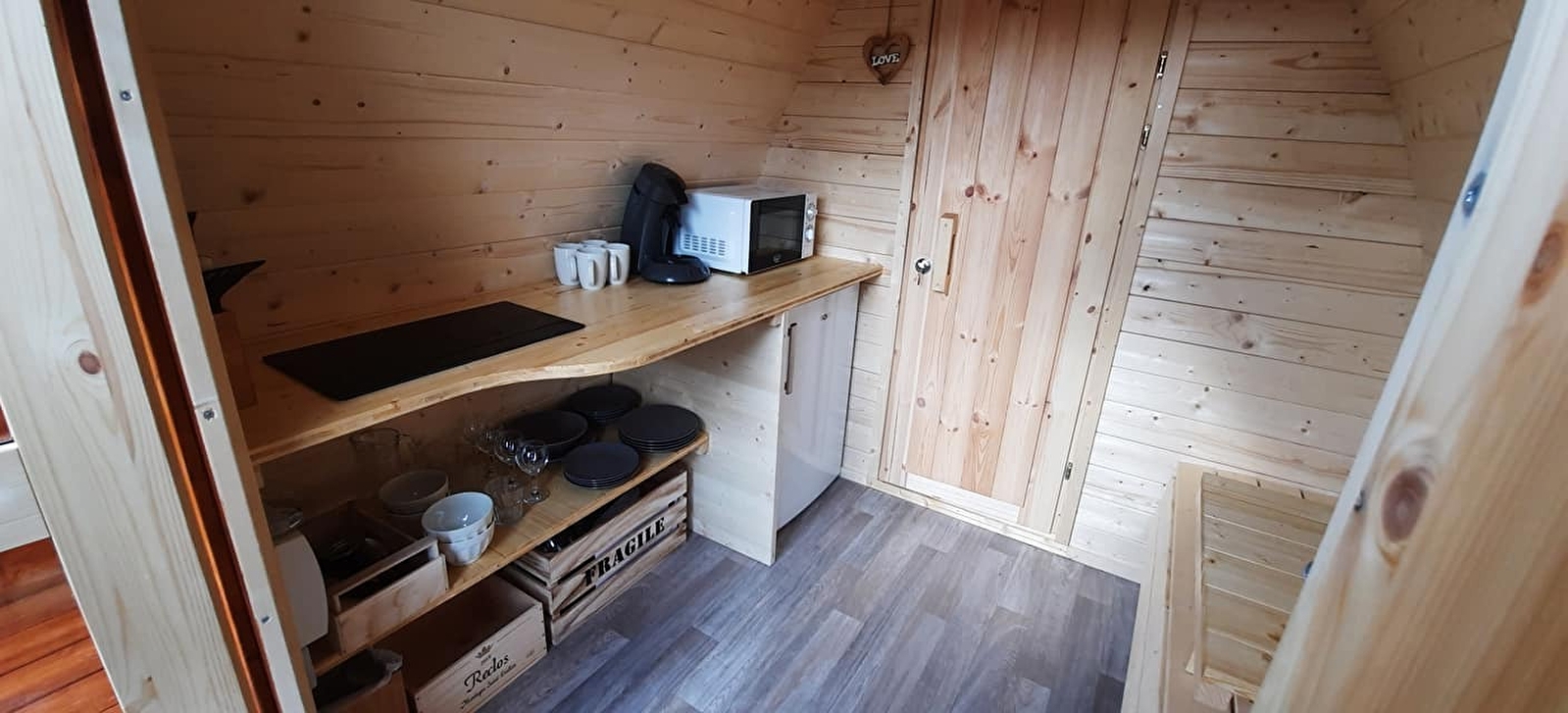 Sur une surface de 12 m², le Pod comprend une pièce de vie avec petite cuisine équipée (plaques vitrocéramiques, réfrigérateur, micro-onde, cafetière électrique, vaisselles pour 3 personnes). Un lit d'appoint rabattable est prévu dans la pièce de vie.