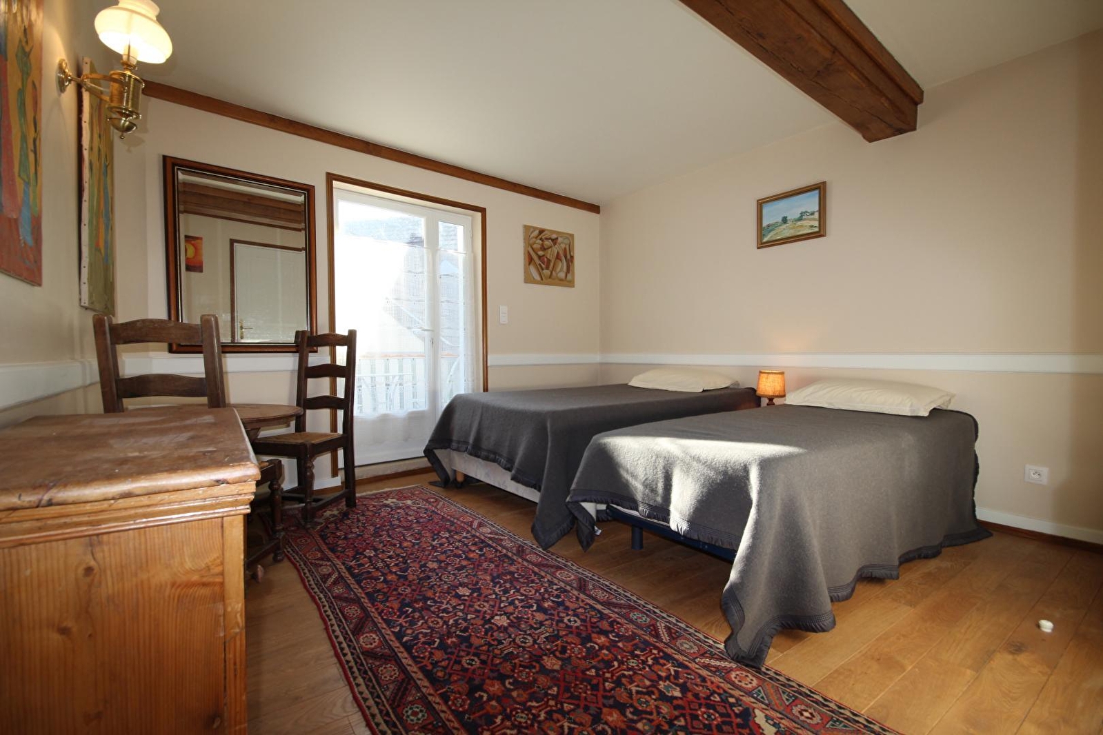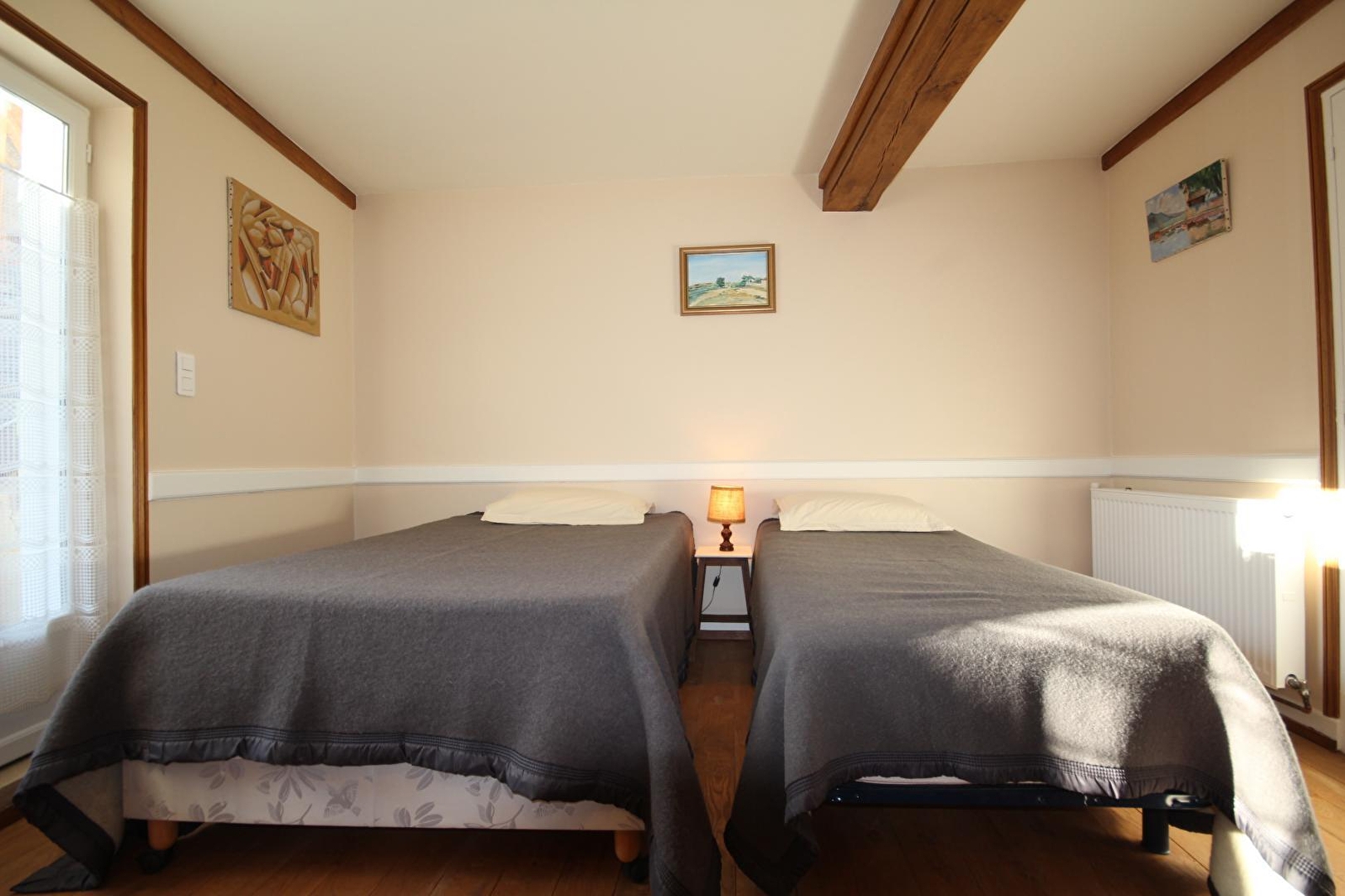 Composition : Maison de village mitoyenne jouxtant un gîte appartenant également au propriétaire (maison individuelle sur la propriété / totale indépendance). Wifi. Chauffage central gaz. Poêle bois dans pièce de vie. Chambre double au 1er étage (lit 1 p. 120x190cm + lit 1 p. 90x190cm) salle d'eau privative (douche/Wc). Petits-déjeuners servis dans le séjour du propriétaire. Balcon abrité + mini jardinet privatifs. Terrain clos. Parking privé. Local vélos. Restaurants & commodités dont supermarché à 5 km.
