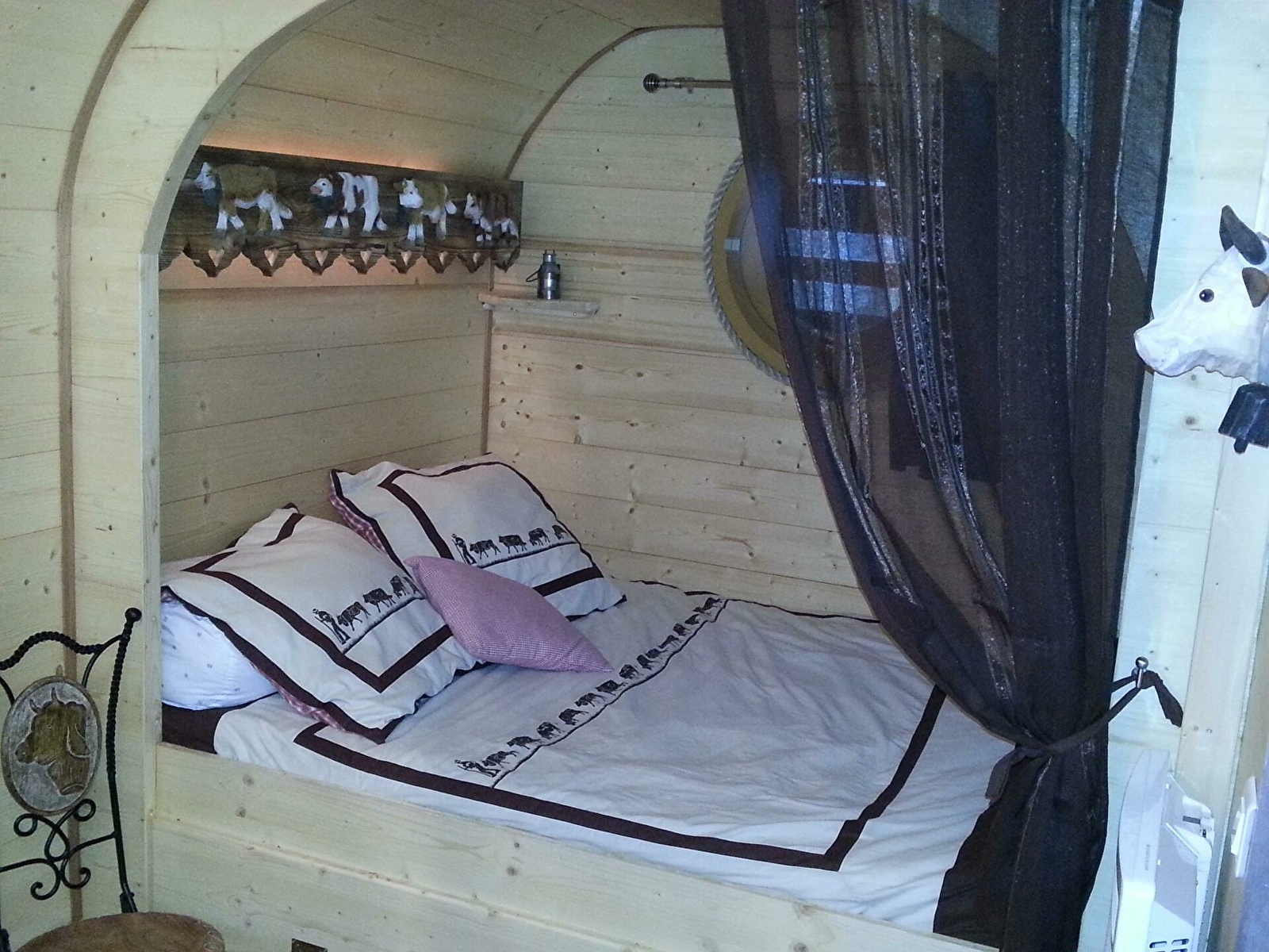 Kitchenette équipée (plaques électriques, réfrigérateur, bouilloire, vaisselle), salle de bain, toilettes, poêle électrique et table extérieure complètent votre hébergement insolite pour votre confort. Panier petit-déjeuner fourni.