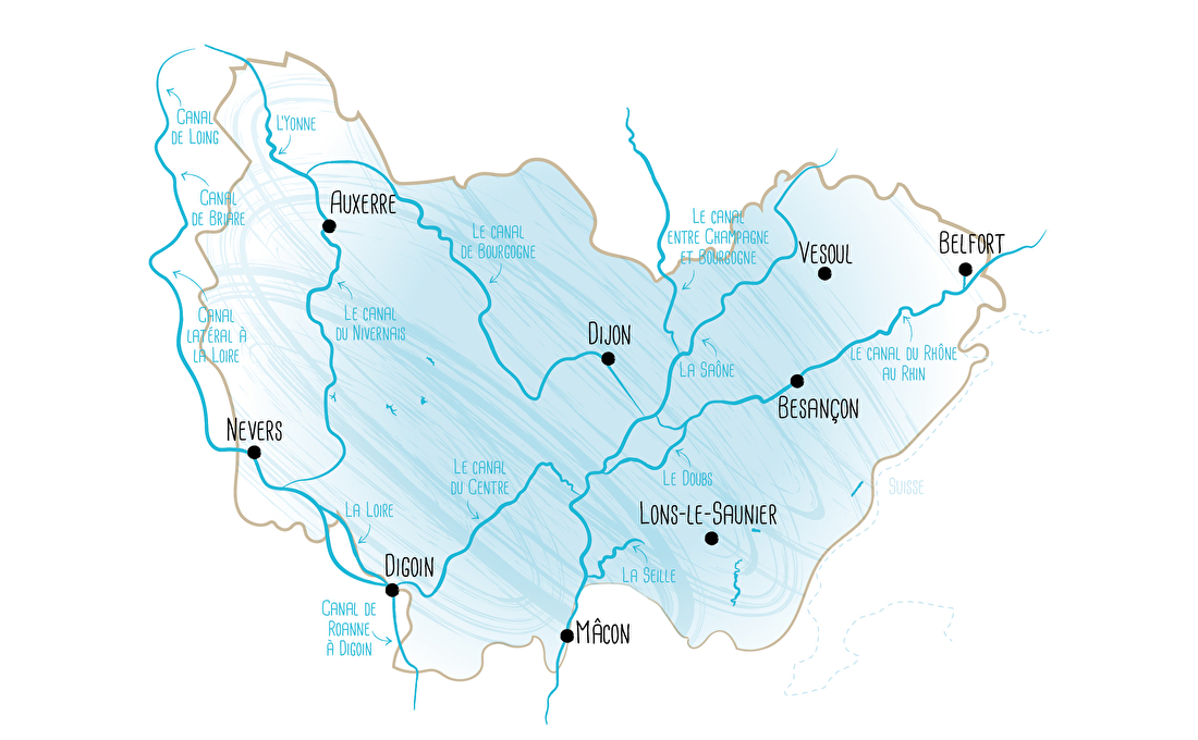 Vous avez une furieuse envie de grand air, de partir loin de tout, de prendre le large ? Pas besoin de partir à l'autre bout du monde pour ça. Notre région c'est pas moins de 8 canaux (canal du Nivernais, du Centre, de Bourgogne, entre Champagne et Bourgogne, de Briare, latéral à la Loire, de Roanne à Digoin et le canal du Rhône au Rhin), 4 rivières navigables (l’Yonne, la Saône, la Seille et le Doubs), soit plus de 1330 kms au total.
