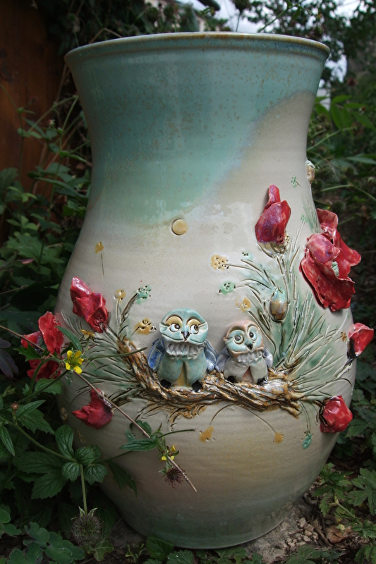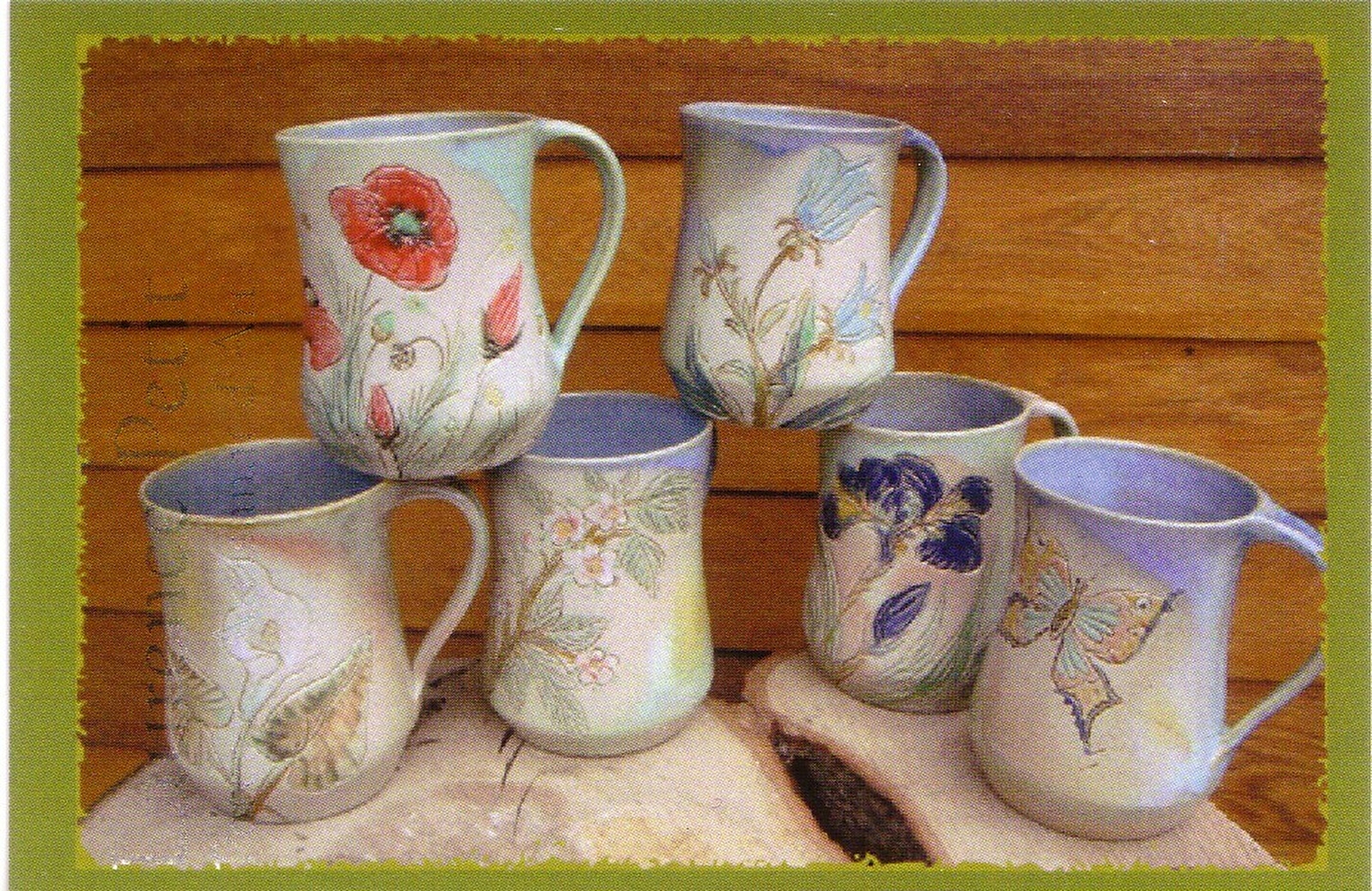 Grès blanc travaillé au tour ou à la plaque, avec des décors uniques et variés (ex. : chouettes, iris, coquelicots...) ou sur commande. Démonstrations de tournage et explications des diverses étapes sur demande.