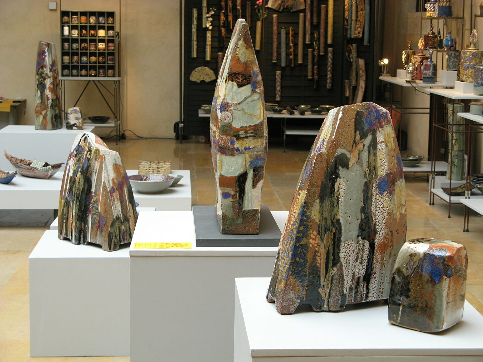 Création de pièces uniques en grès et porcelaine, objets d'environnement décoratif et d'usage, sculptures, coffres, tableaux, barques, montagnes, flacons "Ambroisines", boîtes, vases, bijoux porcelaine. Les Formes, le dessin des signes de la nature et le feu sont nos principales sources d'inspiration. Sensible aux phénomènes de la fusion des roches, des minéraux, nous élaborons nos émaux. Les pièces sont modelées, enrichies de calligraphies, d'empreintes, de gravure. Visite de 2 salles d'exposition et atelier.