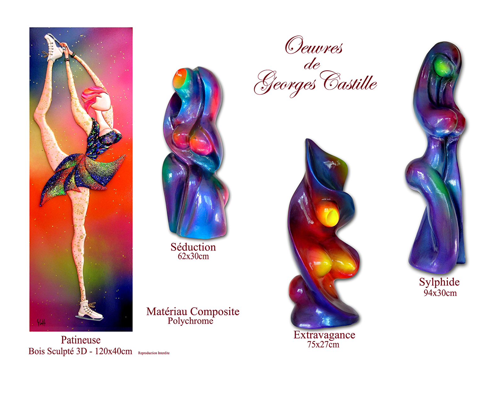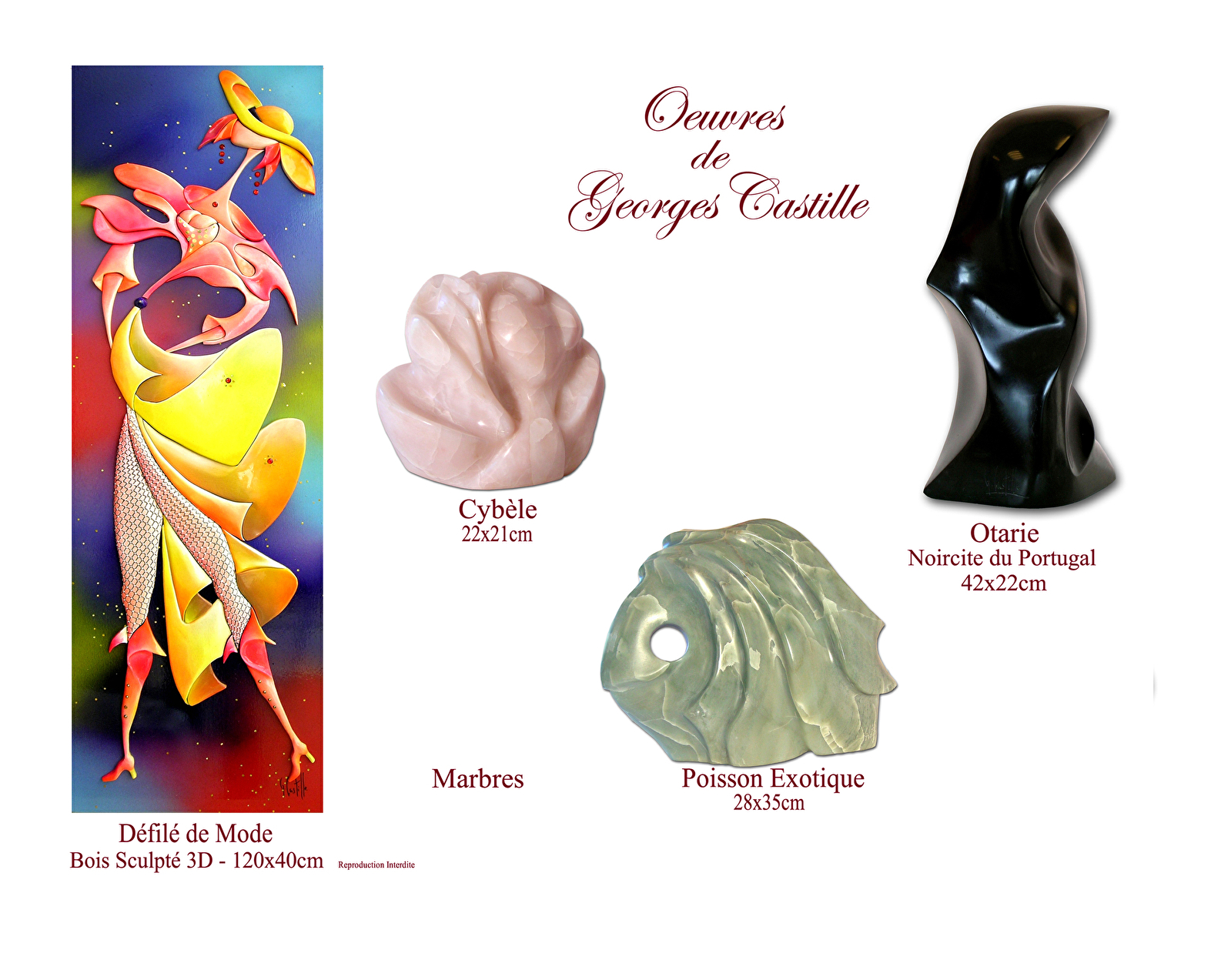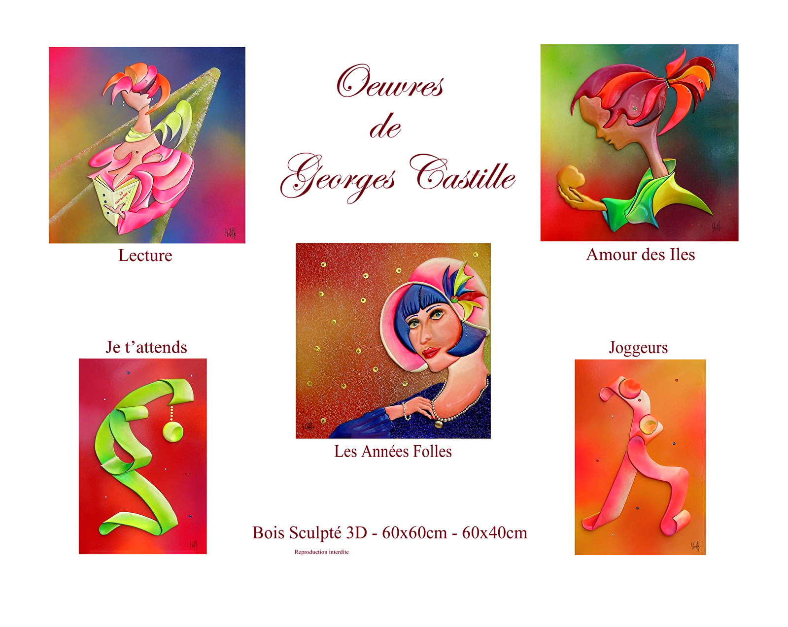 Georges Castille, peintre, sculpteur, plasticien, au fil du temps et depuis toujours, sort de son imaginaire de nouvelles formes, de nouvelles sensibilités. La féminité est source essentielle et inépuisable pour lui. Ses œuvres éclatent de son plaisir de la vie qu'il veut transmettre à tous. Il suggère sans jamais imposer, nous invitant à entrer dans son monde féerique.