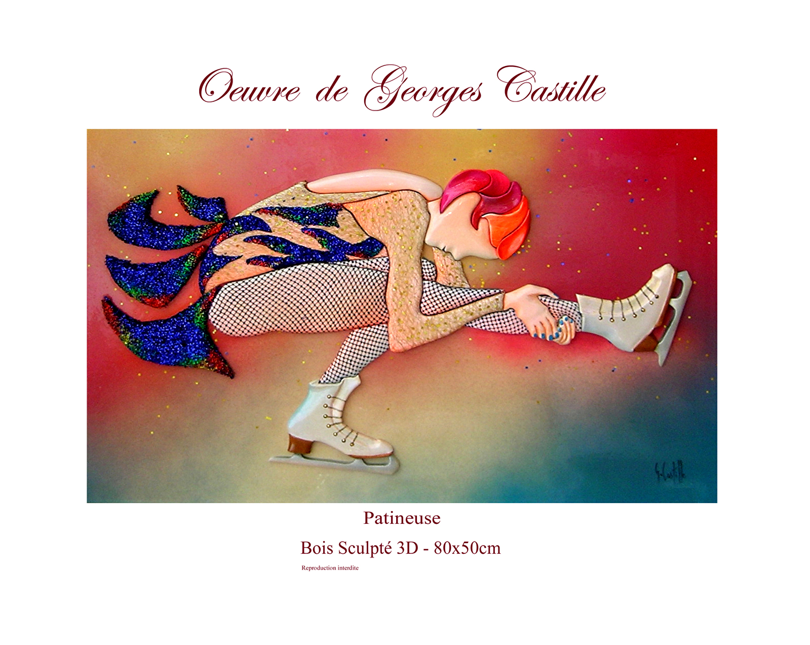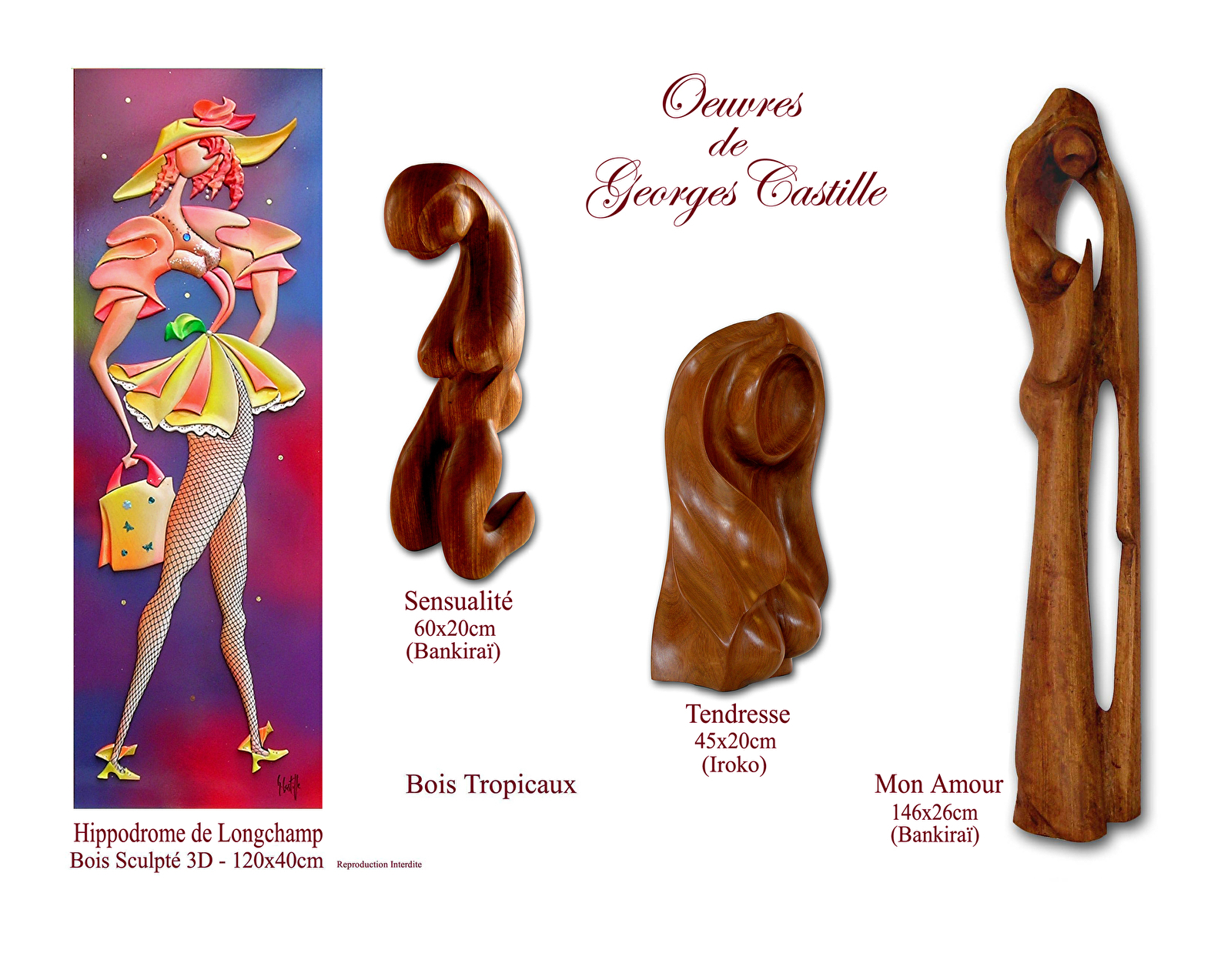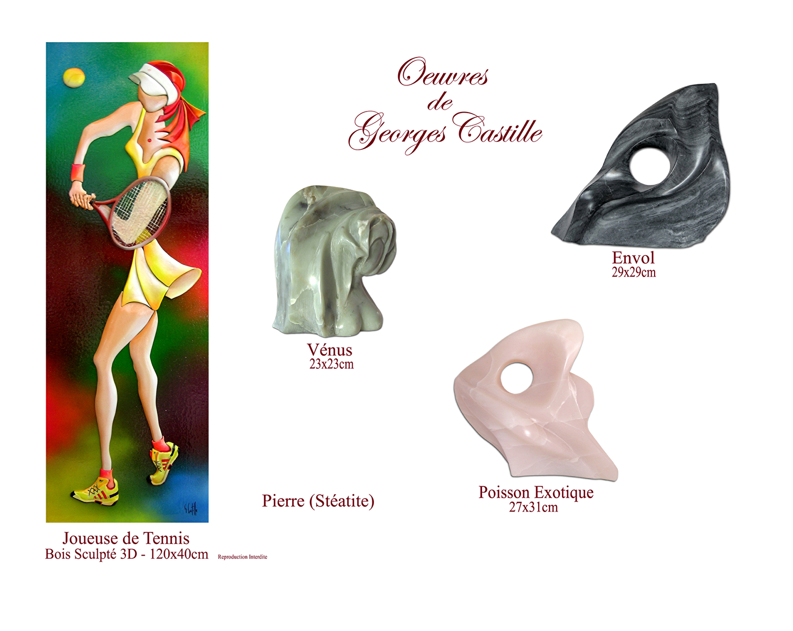 Georges Castille, peintre, sculpteur, plasticien, au fil du temps et depuis toujours, sort de son imaginaire de nouvelles formes, de nouvelles sensibilités. La féminité est source essentielle et inépuisable pour lui. Ses œuvres éclatent de son plaisir de la vie qu'il veut transmettre à tous. Il suggère sans jamais imposer, nous invitant à entrer dans son monde féerique.
