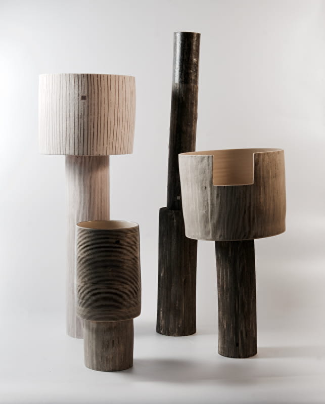 Création de pièces uniques autour du grès blanc et noir. Tournées, modelées et assemblées.