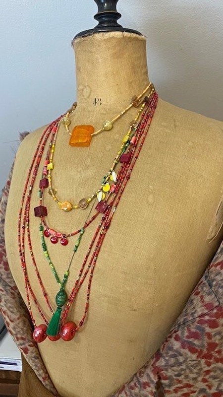 Mes bijoux, quelques centaines de pièces, sont essentiellement conçus avec des pierres semi-précieuses, des perles en verre, de la nacre ou de la céramique auxquelles j’ajoute ma touche d’apprêts, de pampilles, de graines, de bois, de cuir, de tissu...