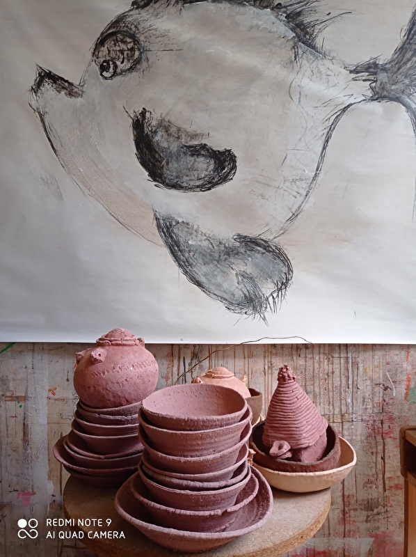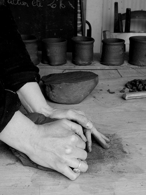 Vous y découvrirez la pratique du tour à pied, du modelage à la plaque (tirée à la coréenne), au colombin (à l'africaine). On y travaille toutes sortes de terre : les grés de Saint-Amand, l'African Stone, la porcelaine, le grés sauvage, la terre de la Plaine Champbertrand et toutes celles offertes aux souvenirs. Elles sont corps, engobes, apportant profondeur, brillance ou satinée. On y cuit dans un four tonneau électrique (1270°C), en plein air (encore à l'africaine, entre 500°C et 750°C) ou à l'étouffée, dans les fours barbotine (950°C). Un four Anagama est en gestation.