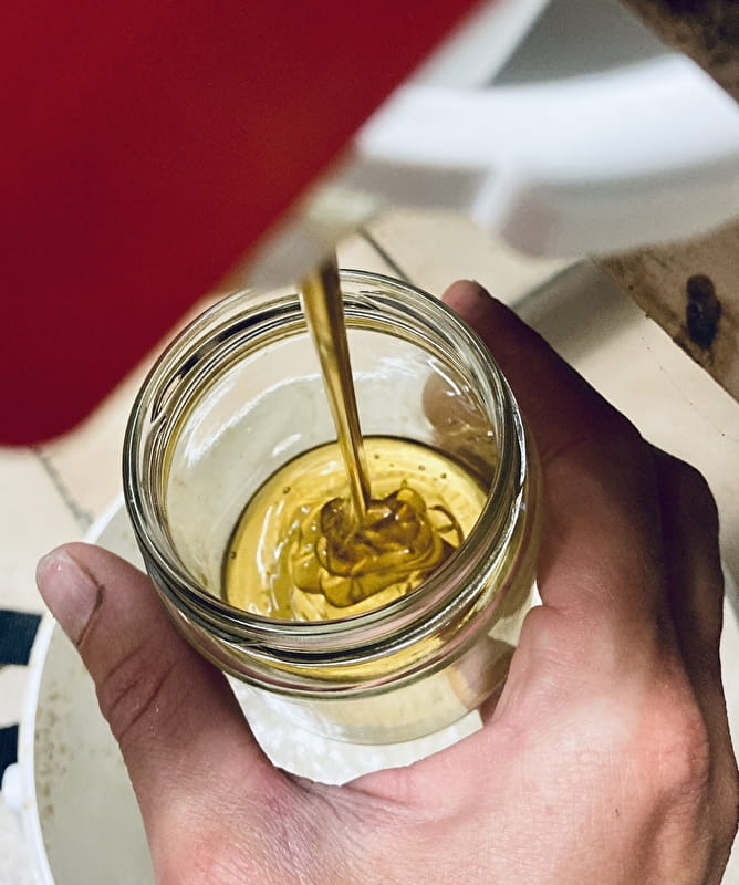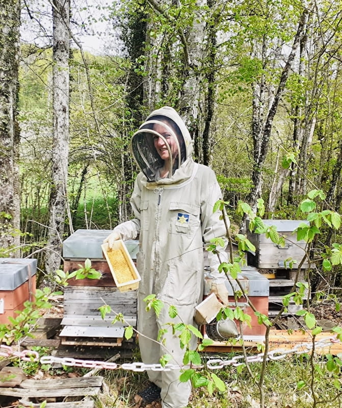 Également apicultrice, découvrez ses produits issus de sa production de miel du Jura : miel de printemps, miel de forêt, pollen, propolis, bougies... .