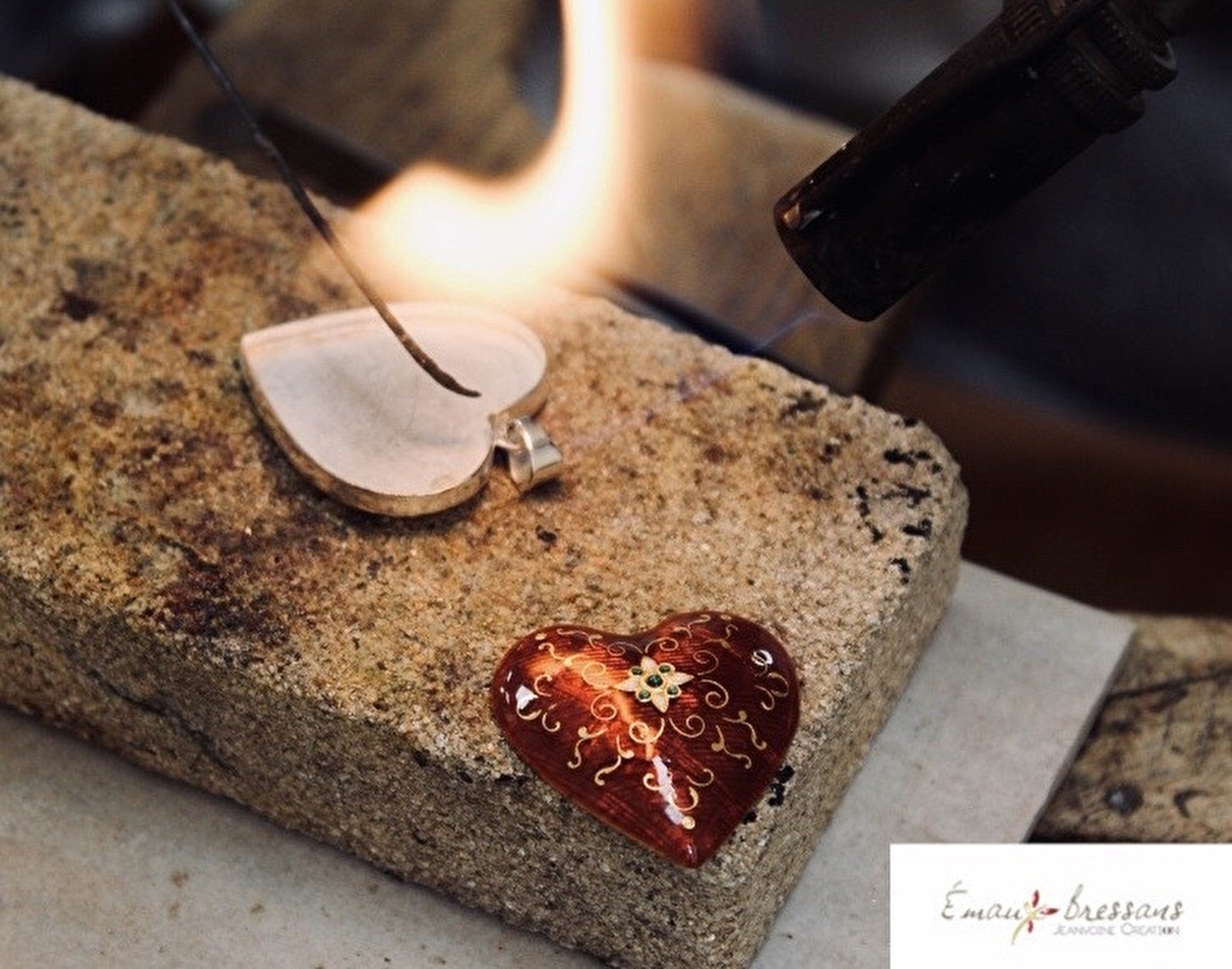 Les émaux bressans sont réalisés à la main sur fond d'argent découpé au marteau dans des plaques laminées. Ce fond présente un relief croisillonné retenant la couleur et est orné de paillons d'or. Plusieurs couleurs agrémentent les créations: bleus, orangés, verts, blanc... De nombreuses déclinaisons sont réalisées dans l'atelier au-dessus du magasin: bagues, boucles d'oreilles, bracelets, montres, pendentifs, et même bouchons de Champagne ou stylos, pour ne donner que quelques exemples.