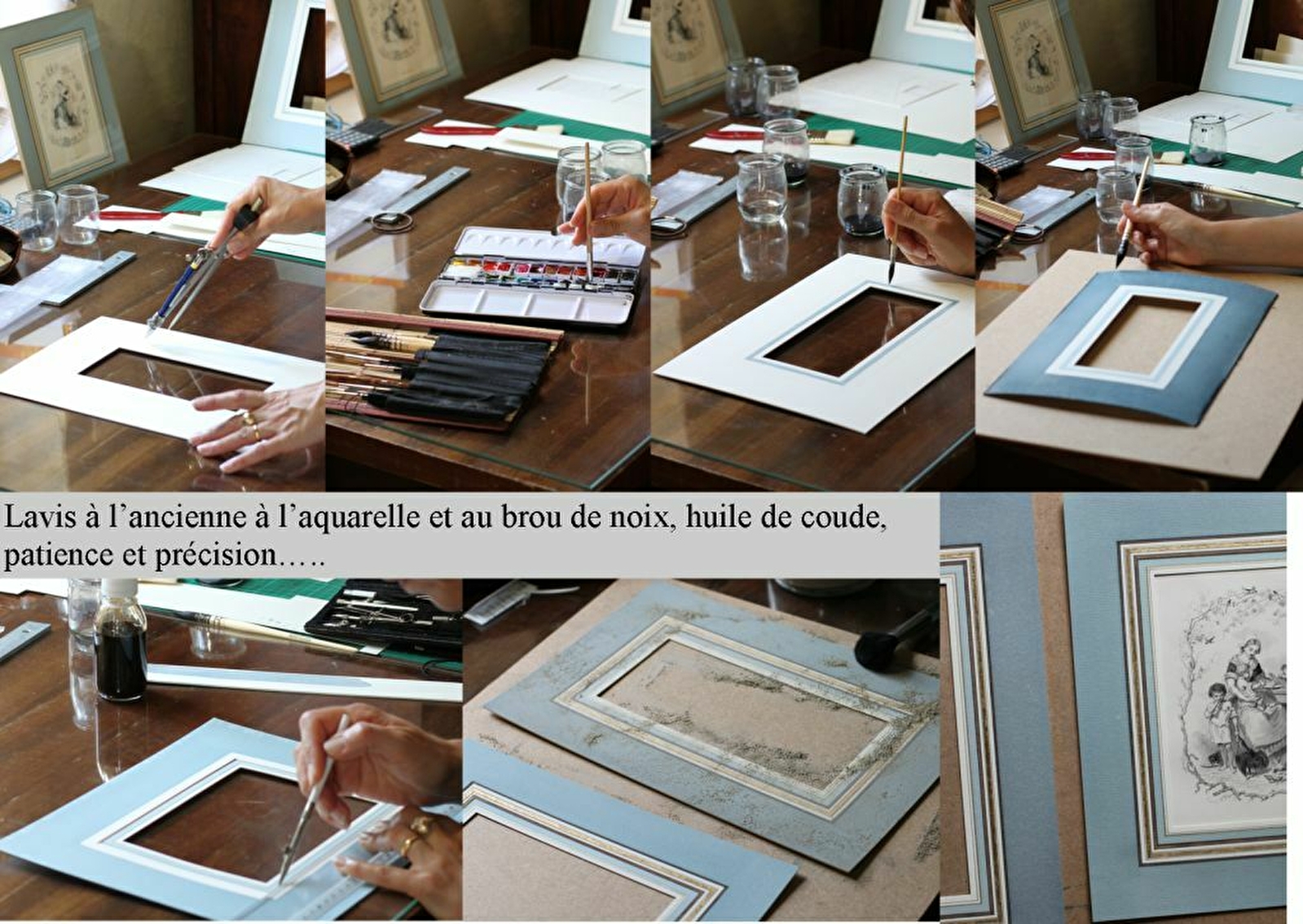 Lors de votre visite, je vous expliquerai notamment les différentes techniques d'encadrement d'Art utilisées au cours des siècles (Lavis à l'ancienne, Lavis Classique, passe-partout contemporain). Vous pourrez découvrir, le matériel utilisé, et les grands principes de conservation. Nous pourrons également évoquer les oeuvres encadrées en différenciant les originaux, les gravures et ses différentes techniques par exemple. L'atelier vous propose également à la vente des oeuvres encadrées, ou à encadrer. Des stages à la journée sont proposés en groupe, pour apprendre à effectuer ses propres encadrements.