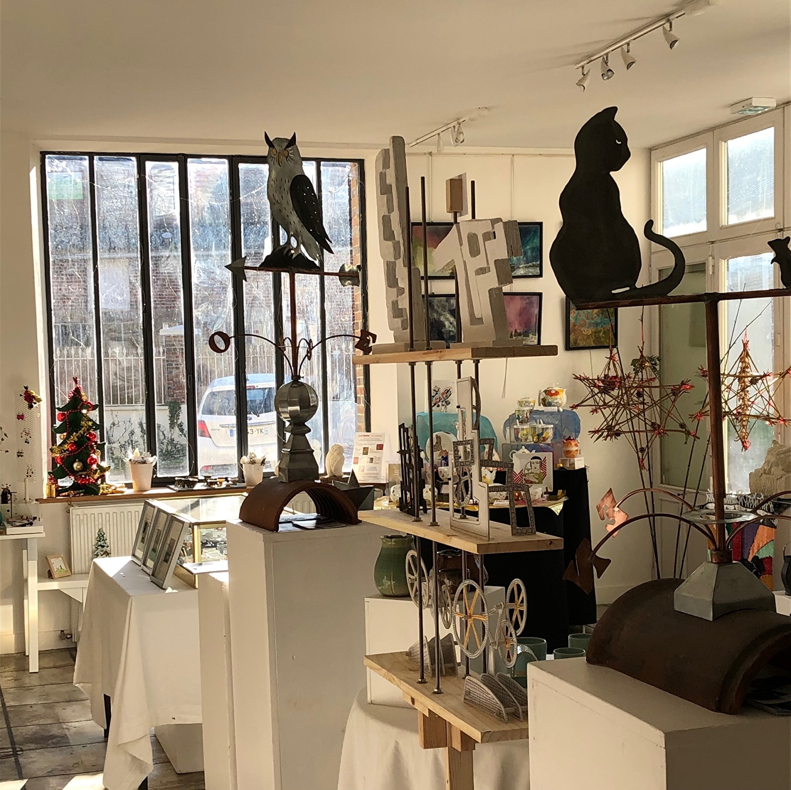 Présentation d'oeuvres d'art, pièces uniques, sculptures, céramiques, bijoux, livres, produits du terroir et vin.