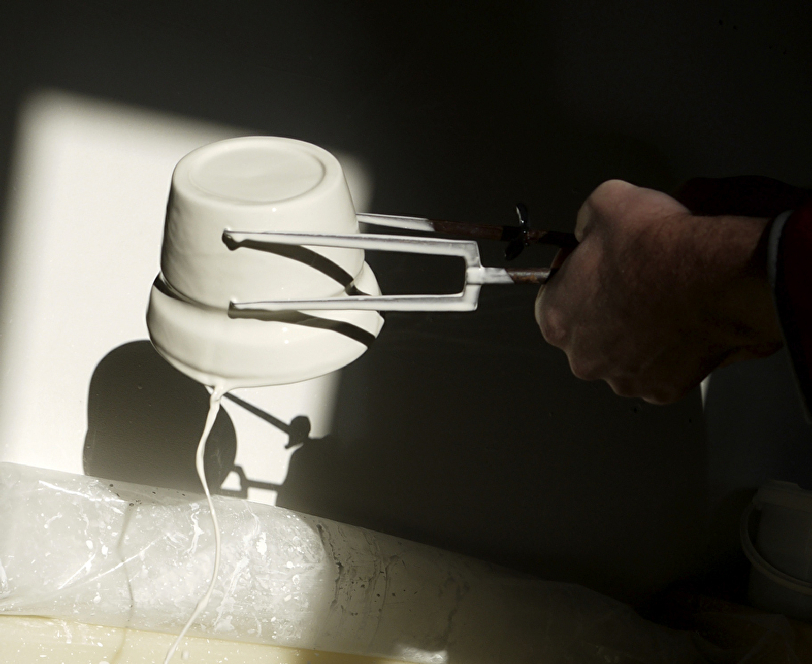 La signature du modeleur, un nœud gravé dans la terre, et celle de la décoratrice, deux nœuds verts, certifient l'originalité de chaque faïence produite dans l'atelier de la faïencerie Georges.