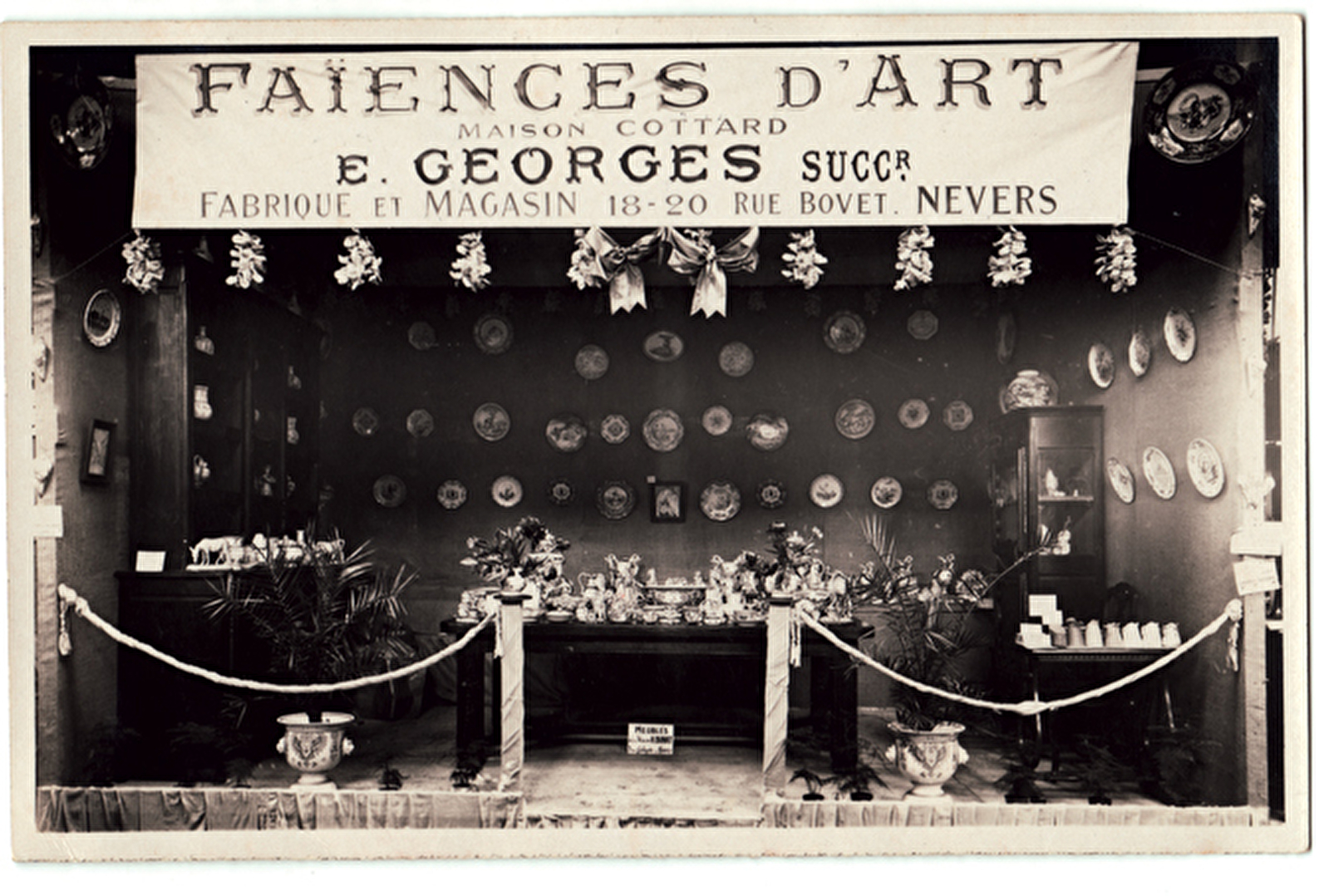 Faïencerie Georges : deux nœuds verts depuis 1898 ! Carole Georges et Jean-François Dumont perpétuent la tradition familiale pour la quatrième génération. Entièrement fabriquée et décorée dans leur atelier, chaque pièce est issue de l'héritage d'un savoir-faire qui a fait la renommée de la faïence de Nevers : modelage de la terre, cuisson du biscuit à 1 060°C, émaillage, décor sur émail cru et cuisson de grand feu.