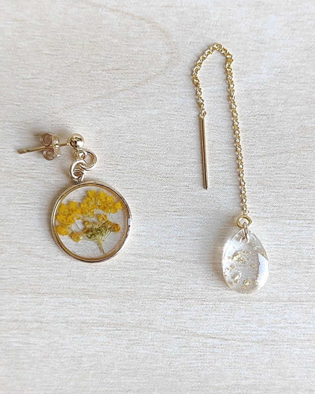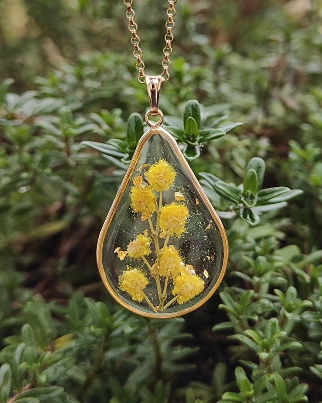 Création de bijoux en résine inspirés de la nature. Chaque pièce est fabriquée à la main à partir de fleurs sélectionnées puis séchées.
