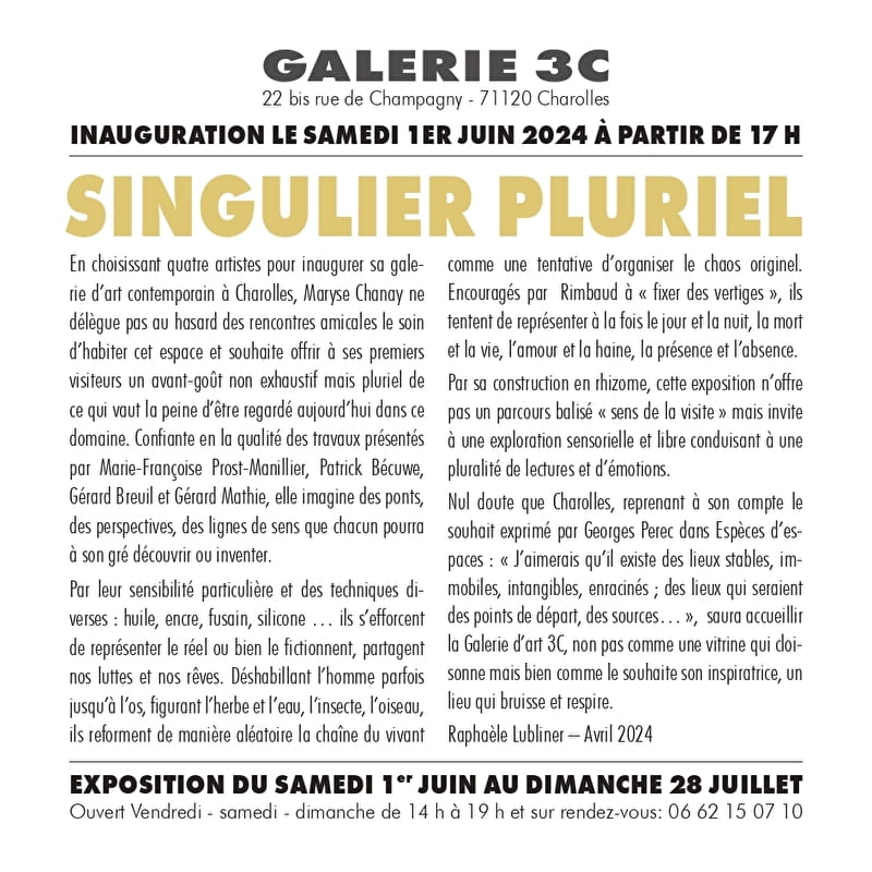 Ouvrir une galerie d’art contemporain à Charolles relève d’un engagement personnel. C’est un hommage que nous souhaitons rendre à la conviction qui anime toute création. La Galerie 3C se veut un espace libre, par-delà les modes qui font autorité dans le monde artistique.