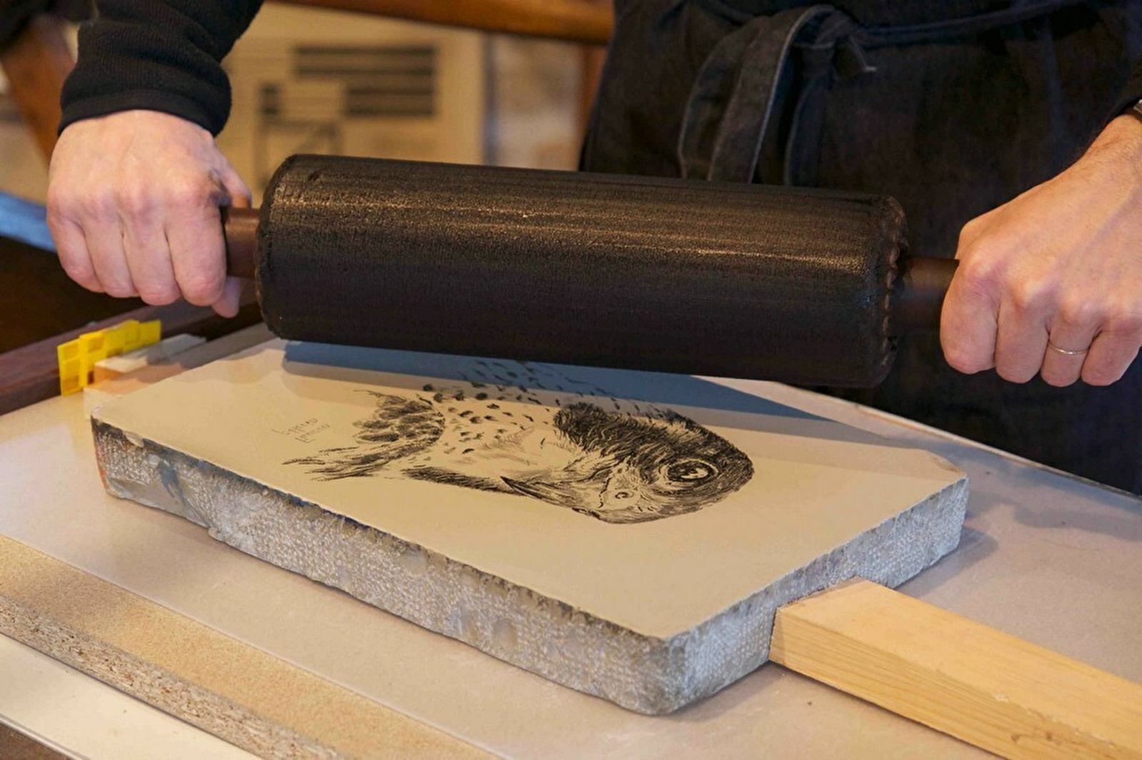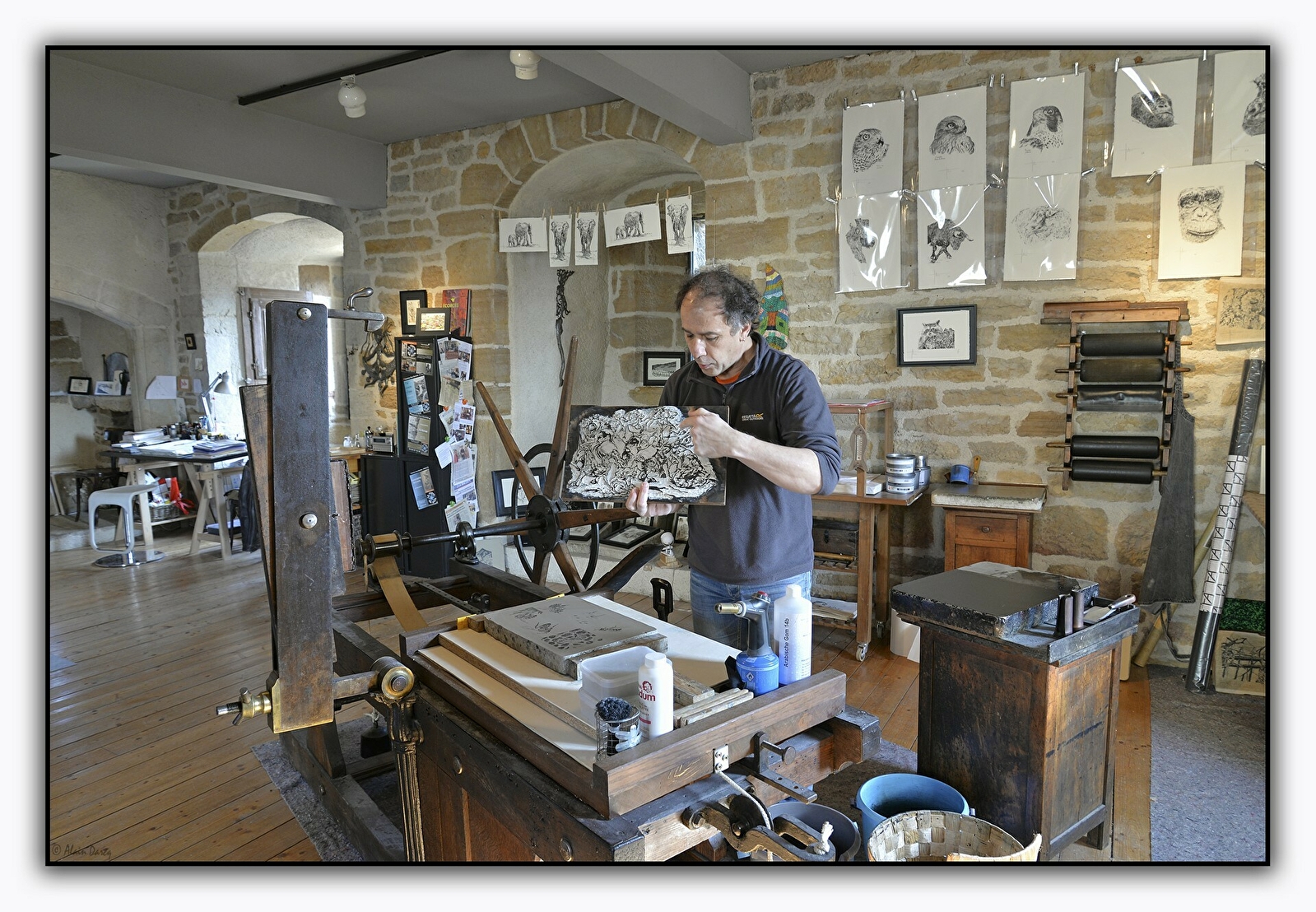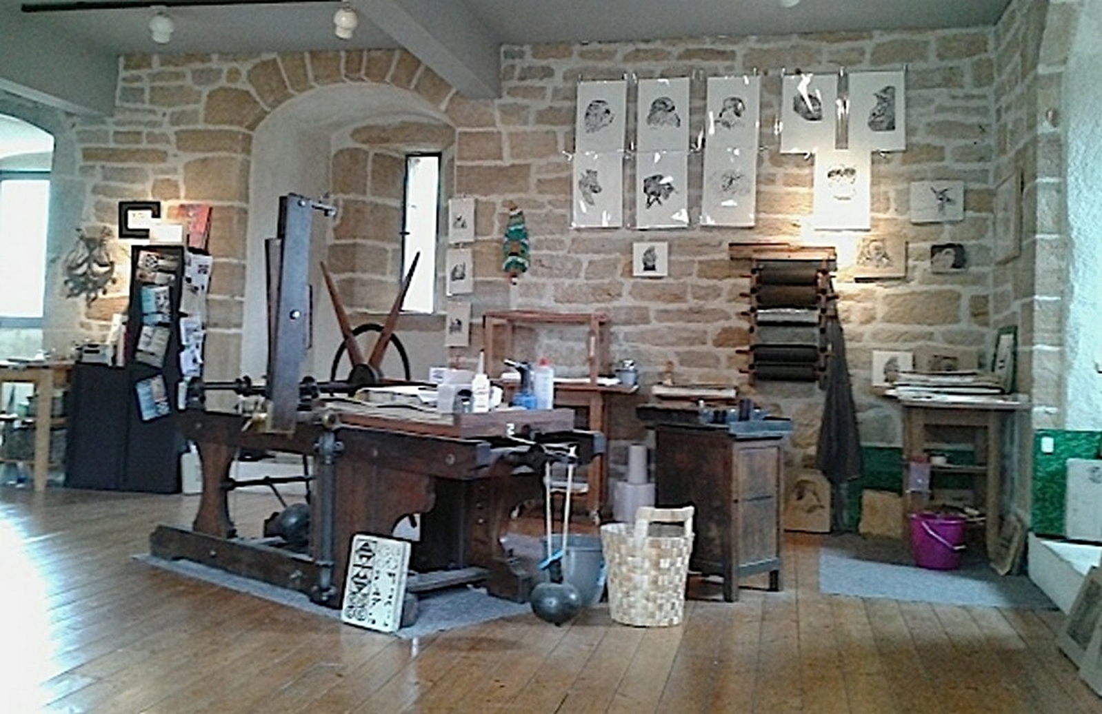 L'atelier peut se découvrir en visite libre mais aussi sur rendez-vous où l'on vous expliquera notamment les processus de la technique lithographique (ponçage/grainage des pierres, dessin, préparation chimique), du tirage d'épreuves sur l'ancienne presse à bras datant de 1860 ou encore de l'authentification des estampes sur une presse timbre à sec.