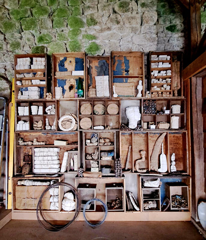 Dans l'étendu de la grange, un monde semble nous observer, et nous contemplons des sculptures organiques, des lampes végétales tentaculaires qui illuminent une série de photographies représentant une femme vue en plongée parée de couronnes. Des horloges comtoises nous rappellent un temps qui a expiré. Le voyage est ici et maintenant.