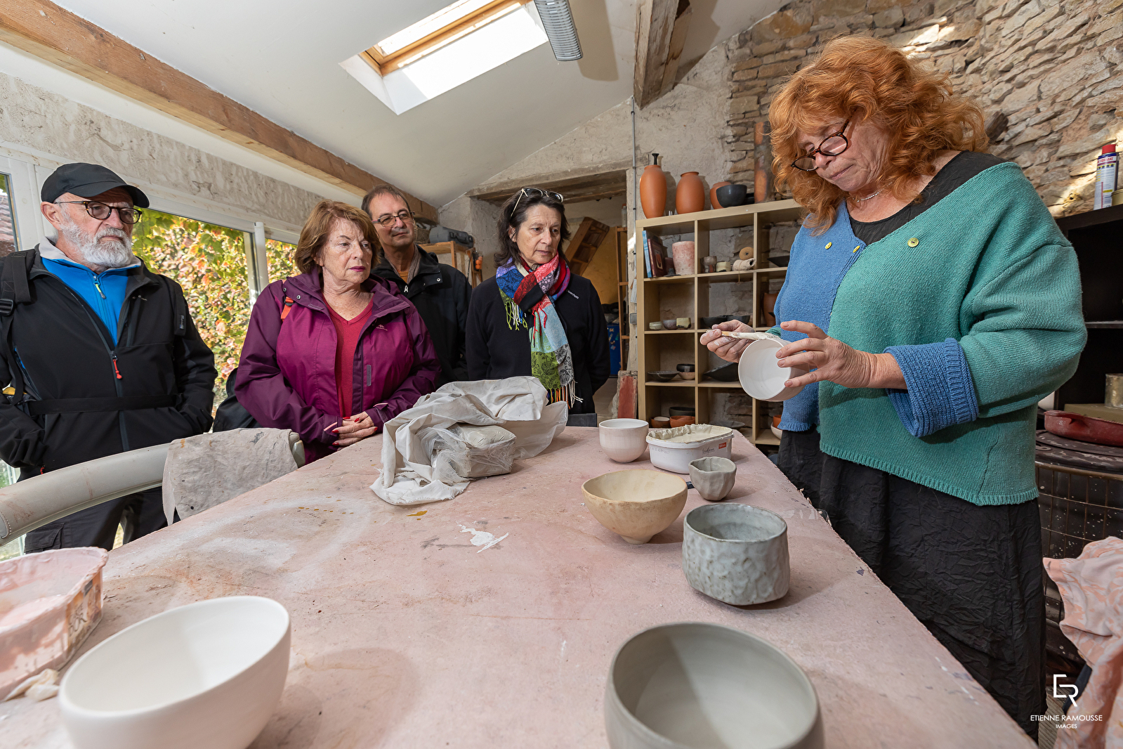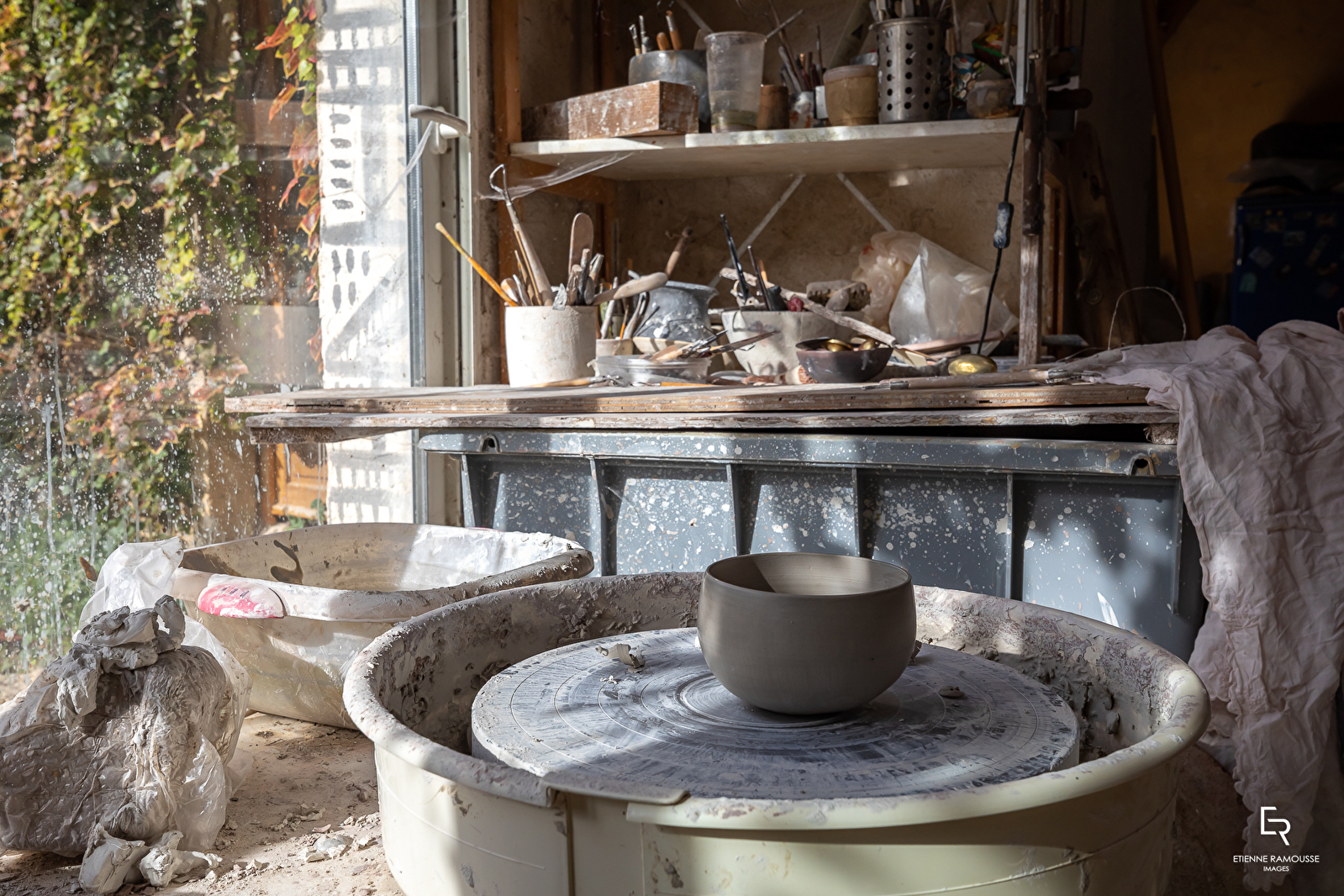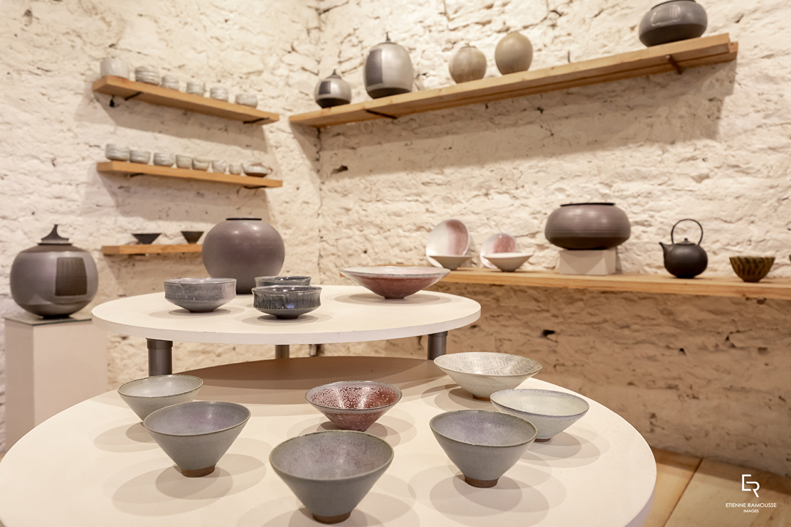 Je polis la pièce (faite à la main en utilisant la technique du colombin) pendant le processus de séchage. Après une première cuisson, je pose une sous-couche de porcelaine sous l'émail qui empêche celui-ci de s'accrocher sur la pièce. Pendant la cuisson l'émail font sur la sous-couche à laquelle adhère à la pièce. Après cuisson je peux enlever la sous-couche et l'émail et ainsi je crée mes décor. La deuxième cuisson se fait dans un four à bois ainsi que l'enfumage.