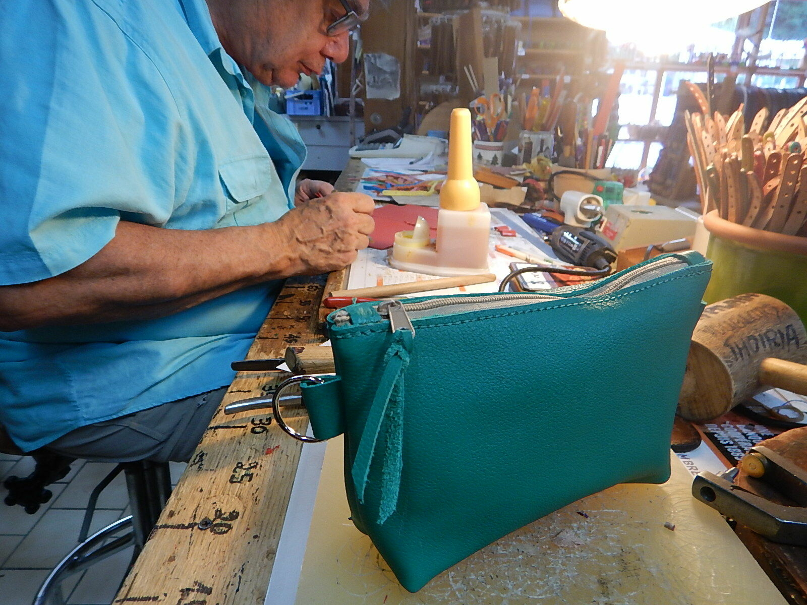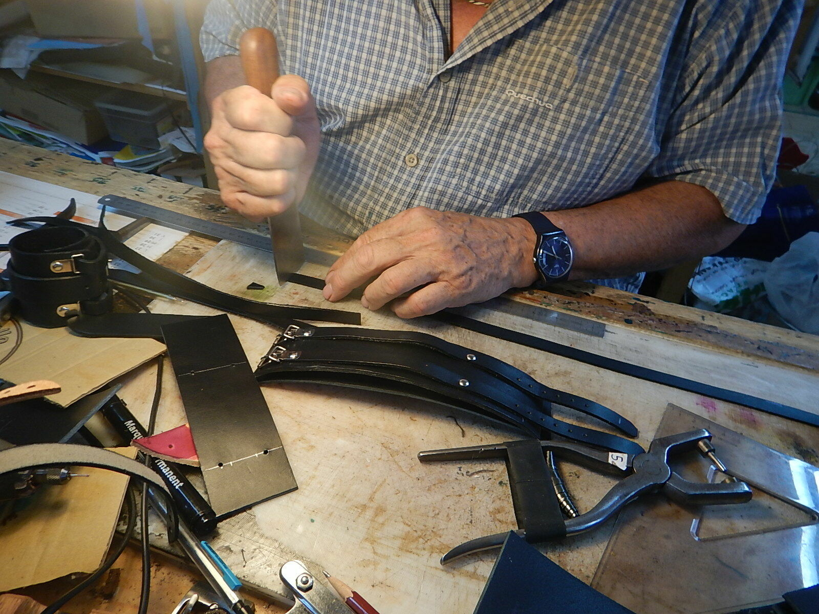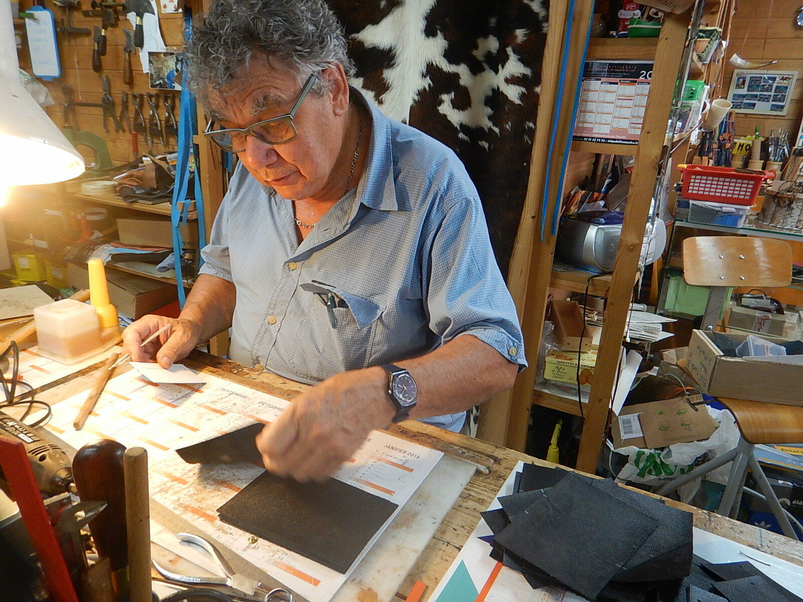Vente sur rendez-vous à l'atelier, Le CUIR du JURA - Artisan - Fabricant- travaille depuis 40 ans dans le respect de la Tradition. Il crée chaque modèle en recherchant un équilibre entre l'esthétique, l'originalité et l'utilitaire. Ses choix de matière se portent sur des cuirs français avec un tannage naturel et végétal. Les ceintures en croupon épais de haute qualité, sacs, pochettes, étuis pour couteaux, téléphones etc, maroquinerie et bracelets ainsi qu'articles spécifiques pour chien.
