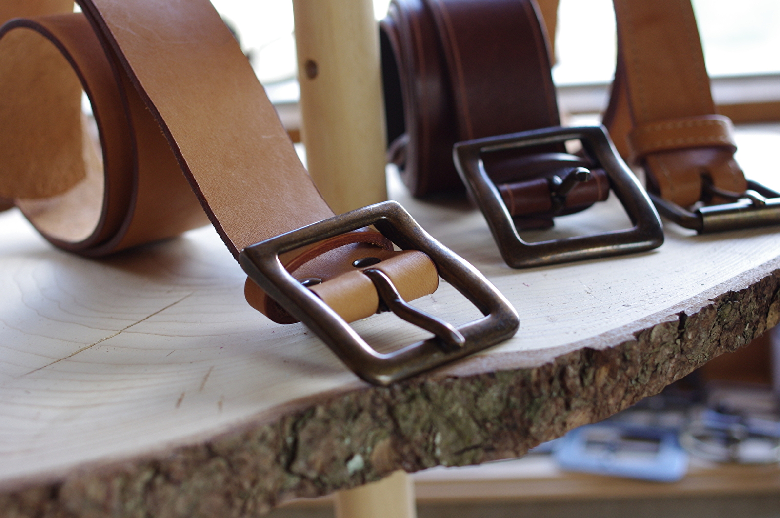 Les ceintures sont réalisées en cuir au tannage végétal, elles peuvent être personnalisées (sur commande) et ajustées à votre mesure sur place.