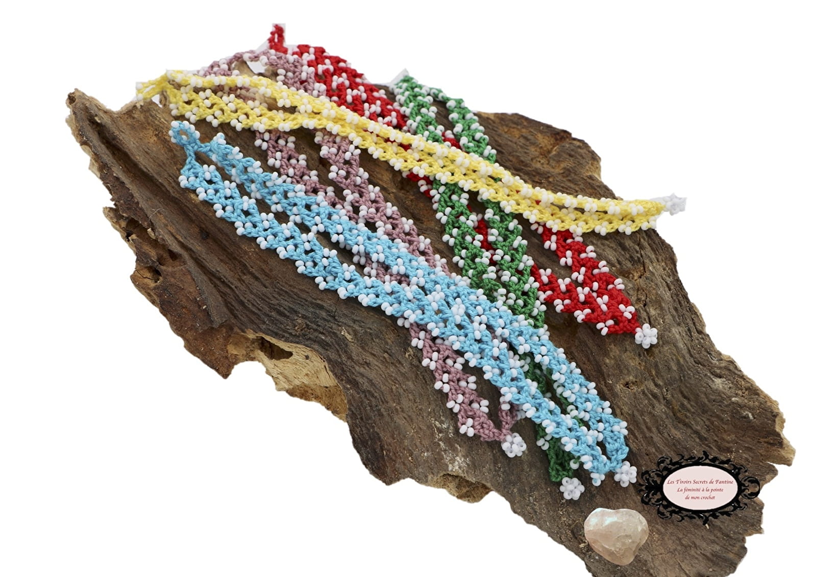Mes colliers, bracelets sont hypoallergiques, ils se ferment par une élégante boule de Rocailles de Bohème à glisser dans un maillon perlé. Je travaille uniquement avec des cotons Oeko-Tex.