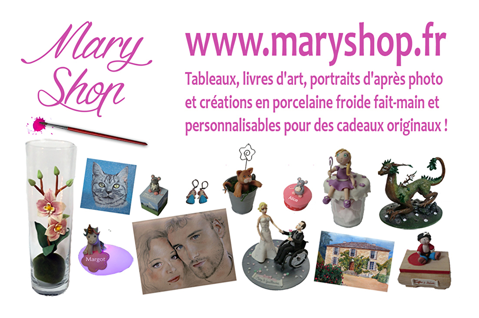Création d'objets en porcelaine froide pour en faire des figurines, lampes, boîtes, porte-photos, porte-clés, couvercles de pots en tout genre... Personnalisation possible sur demande.