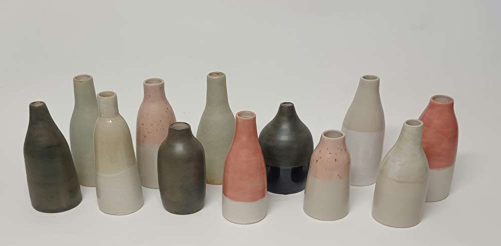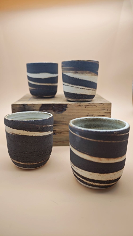 Nous travaillons le grès blanc lisse, ainsi que du grès noir et un grès chamotté à haute température selon diverses techniques telles que le tournage, le travail à la plaque ou le modelage au pincé. Nous réalisons la majorité de nos propres émaux à haute température issus de nos recherches.