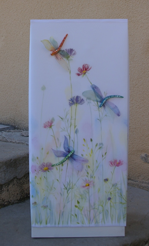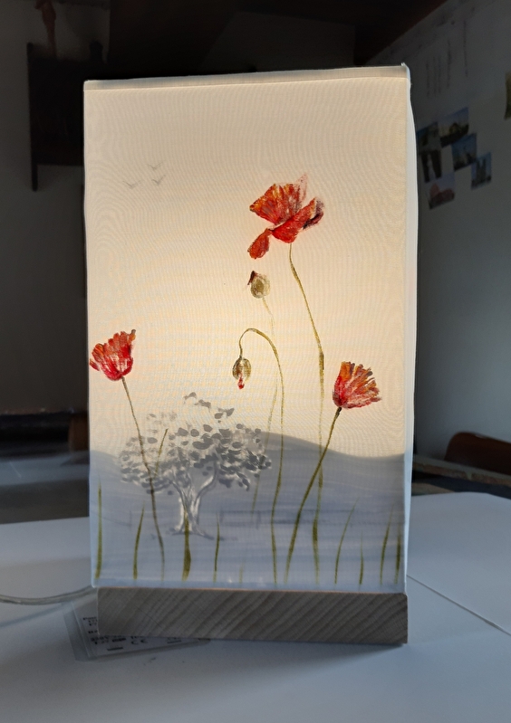 Peinture sur lin, coton, soie... Lampes, nappes, tableaux animaliers, coussins, tabliers, panneaux décoratifs. Travaux sur commande. Cours de dessin, peinture. Salle d'exposition.
