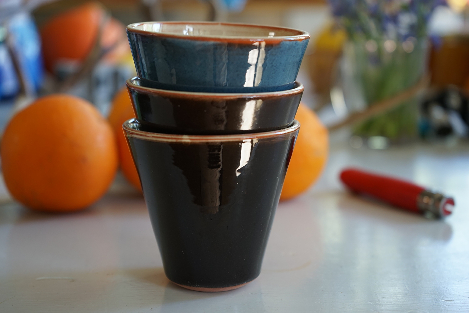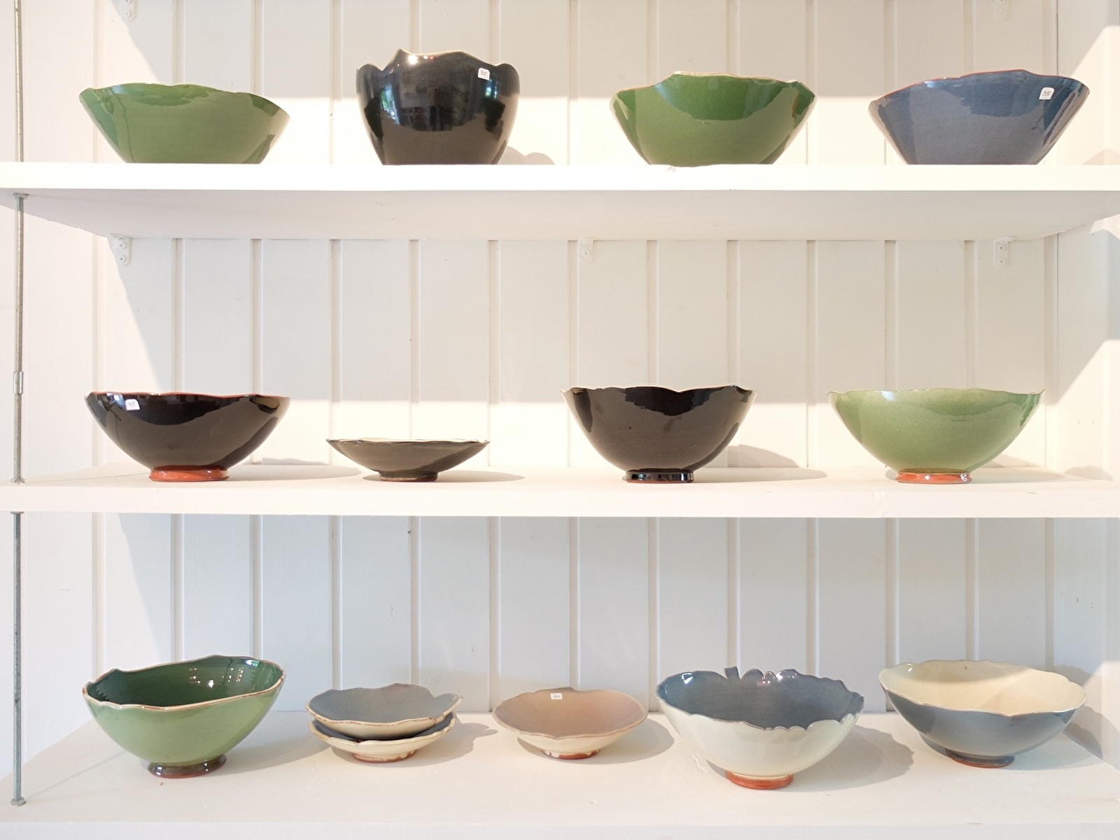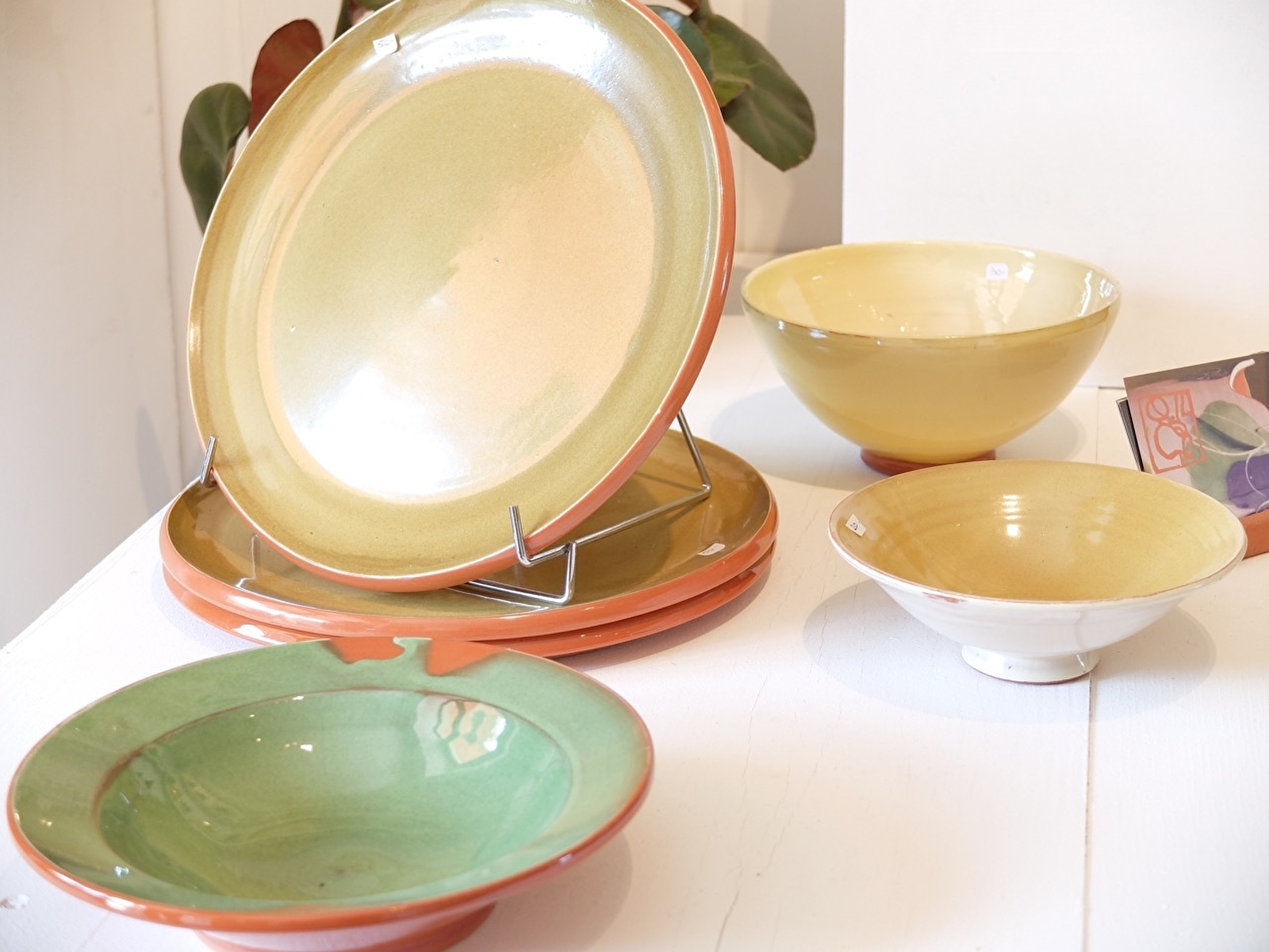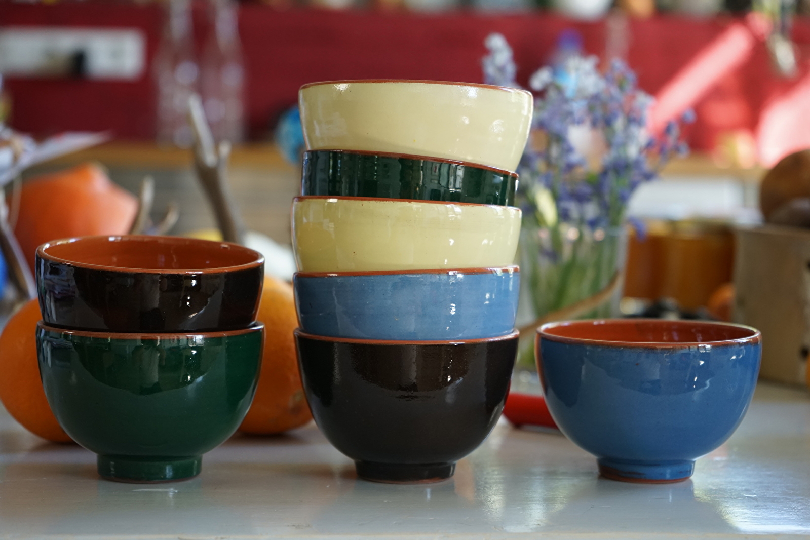 Une fois cuite, la pièce est décorée. Dans son atelier, Marie-Ange expose nombre de ses créations en terre vernissée : saladiers, plats à gratin, bols, tasses, pichets, lampes, dessous de plats, pots à miel ou même entonnoirs à confiture.