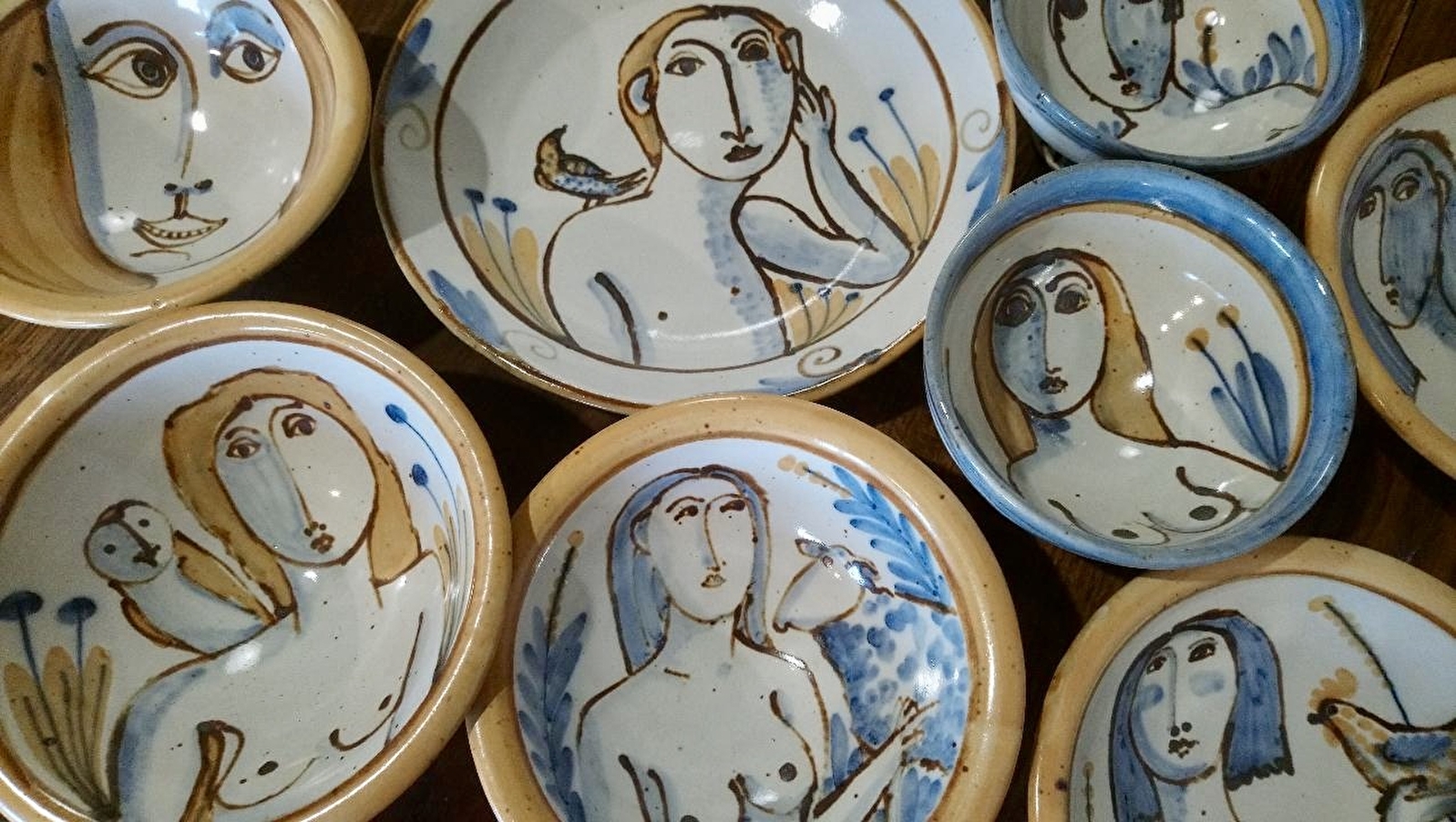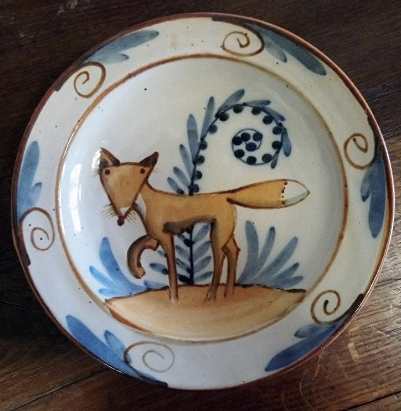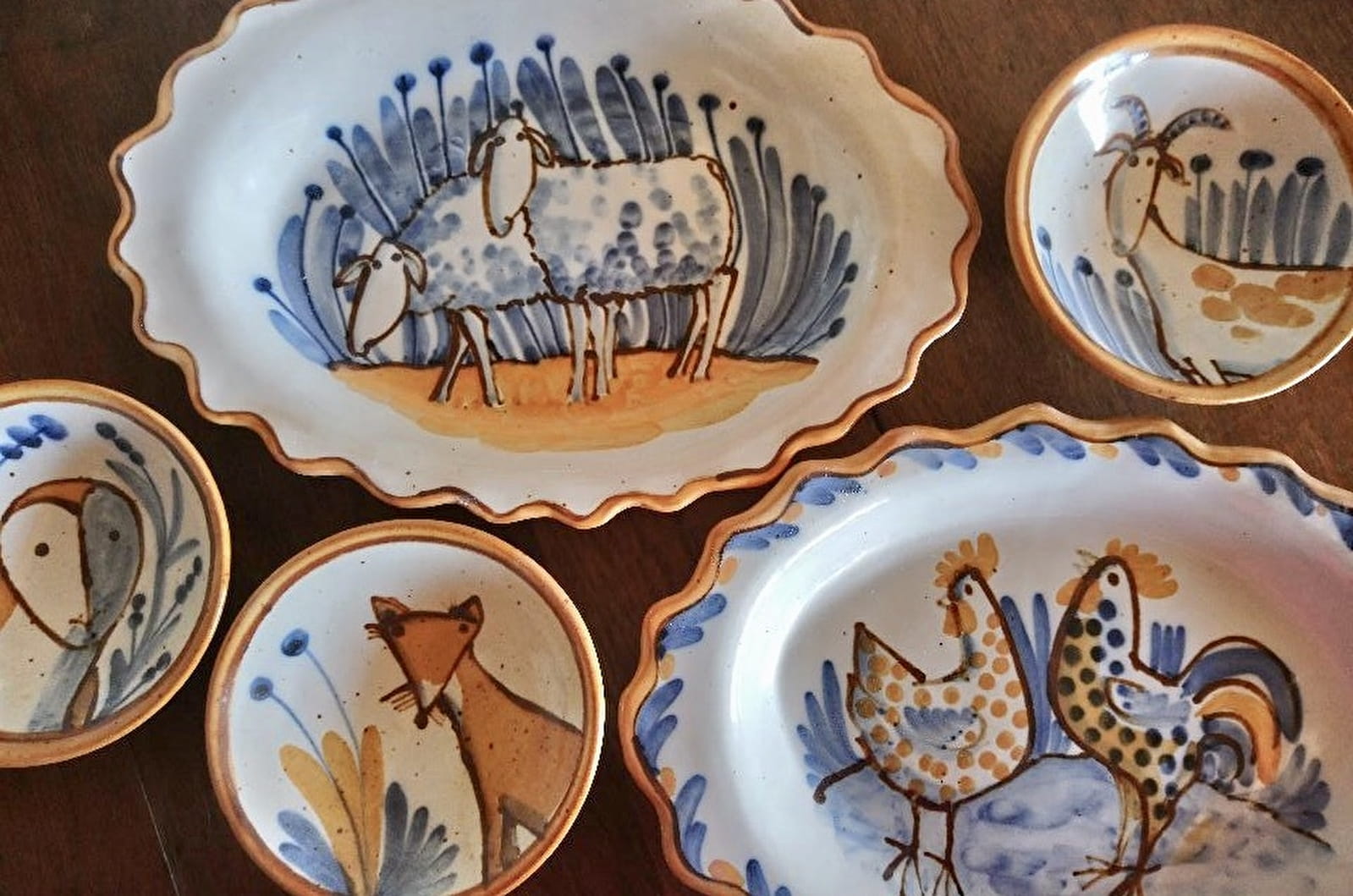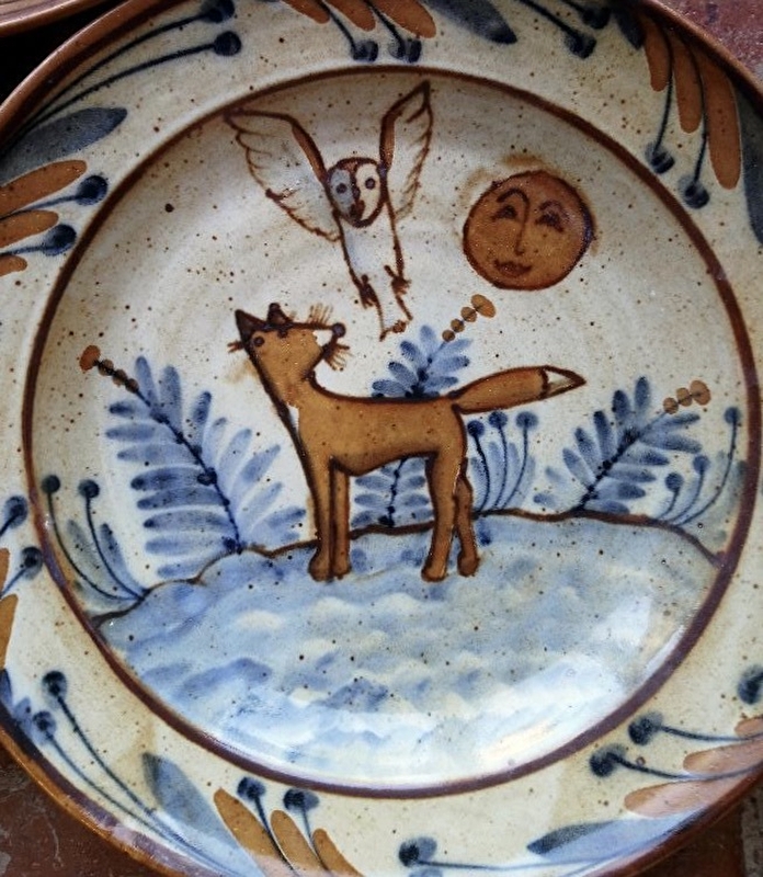 Poteries fait main, tourné en grés avec décor à main levée d'animaux et plantes.