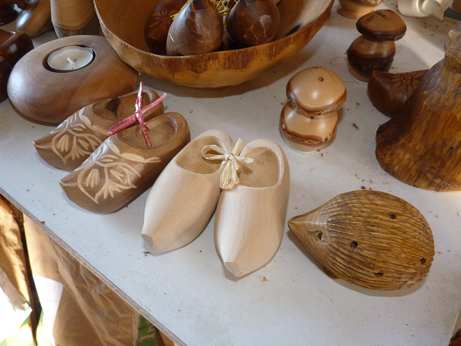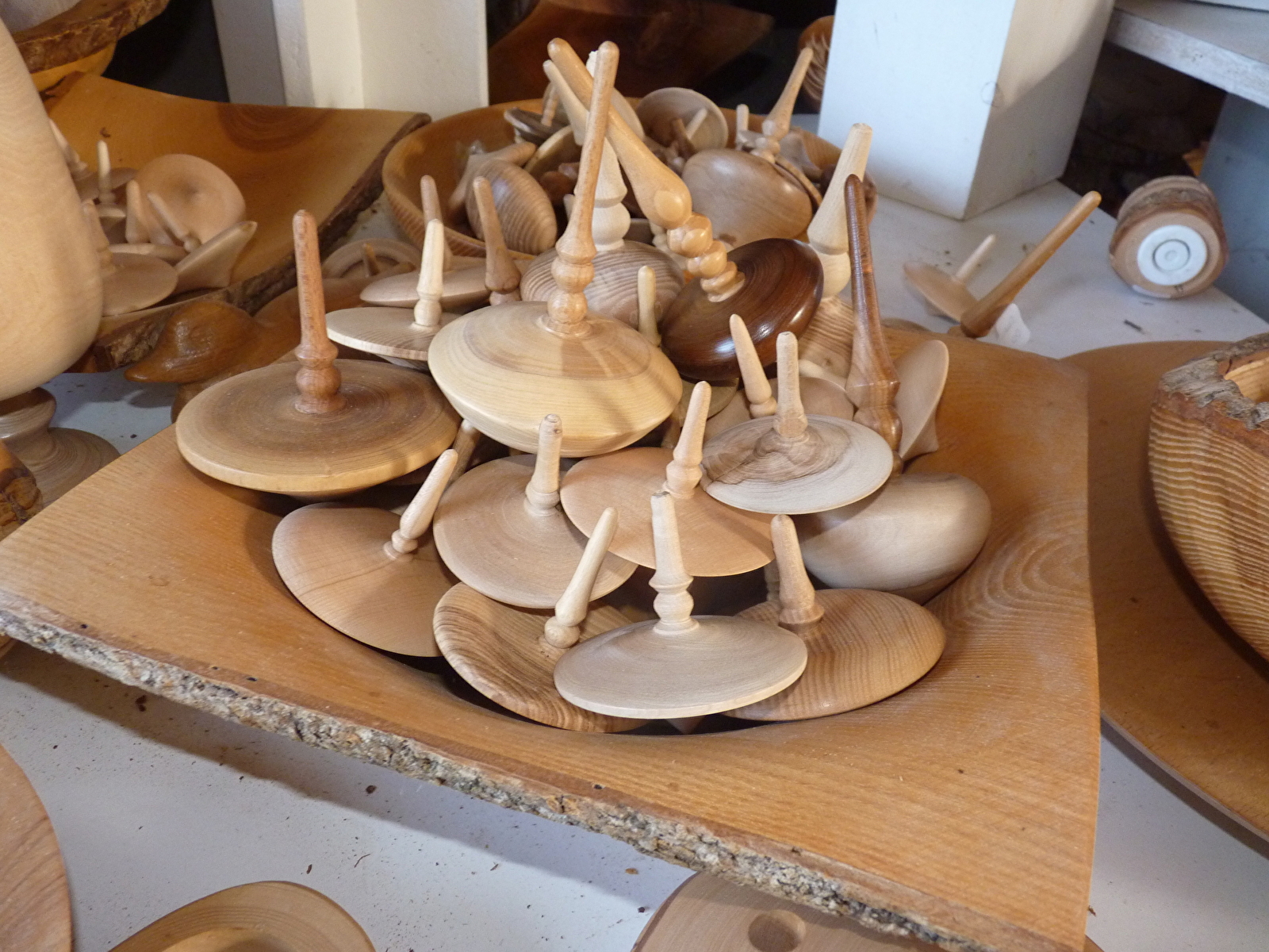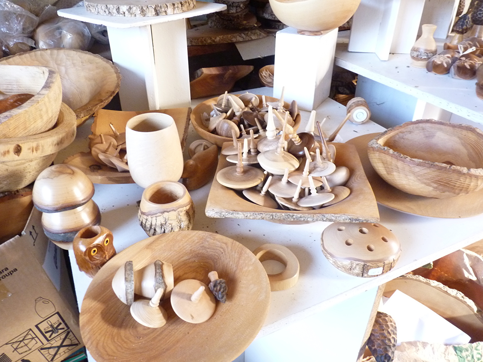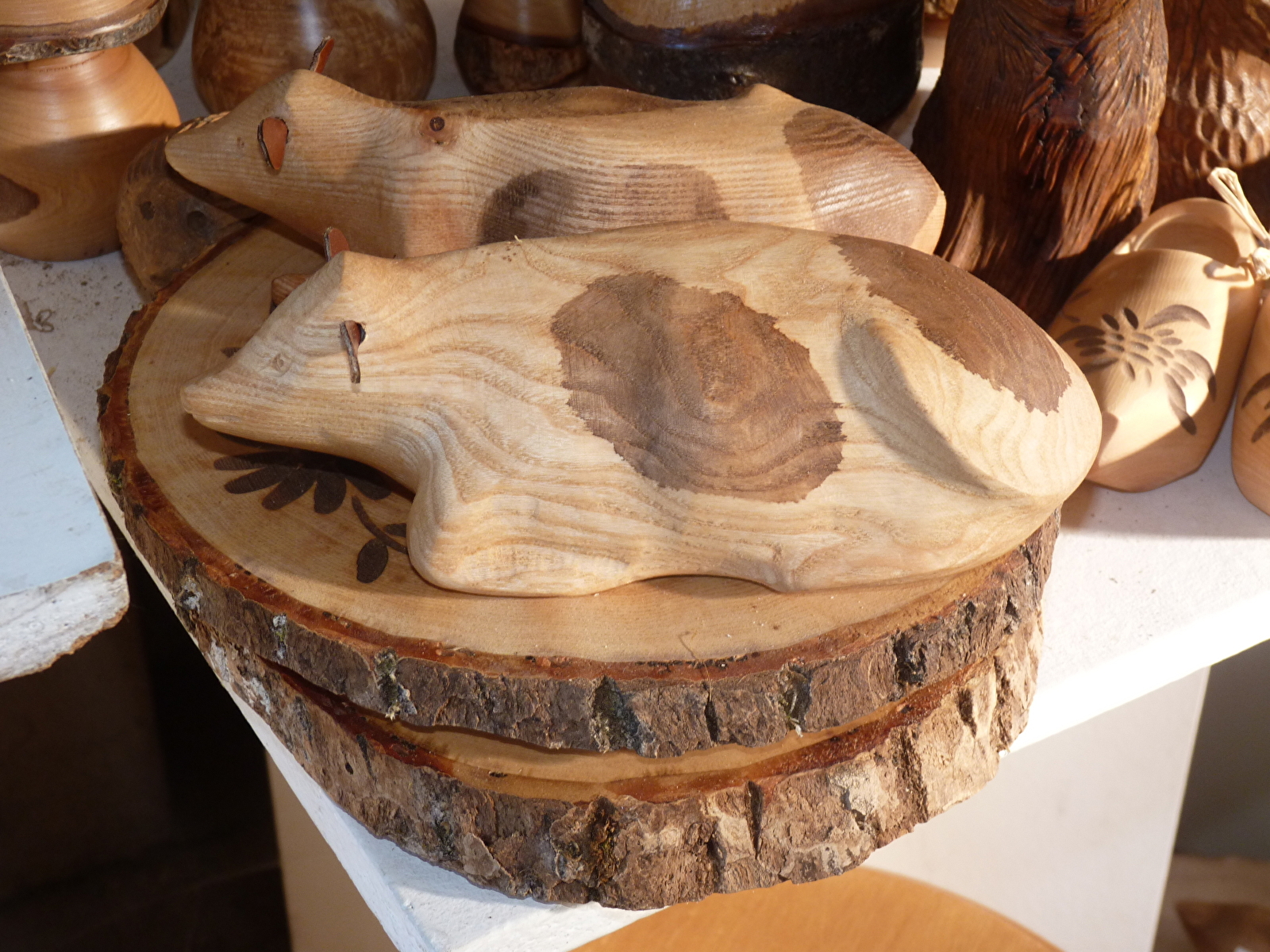 La fibre artistique du Jurassien s'exprime également à travers des sculptures pour lesquelles il utilise la charmille rouge, le frêne, le tilleul... De ces essences locales naissent chouettes, champignons et ustensiles divers : tirelires, porte-bouteilles, coffres, porte-crayons, coupelles... Certains objets comme les toupies peuvent être vendus en finition brute. Les enfants peuvent ainsi les personnaliser à leur guise ! Ce passionné met un point d'honneur à faire découvrir ses gestes créatifs au public. Vous serez de même émerveillé par les trésors sortis de son imagination qui sont exposés derrière son atelier.