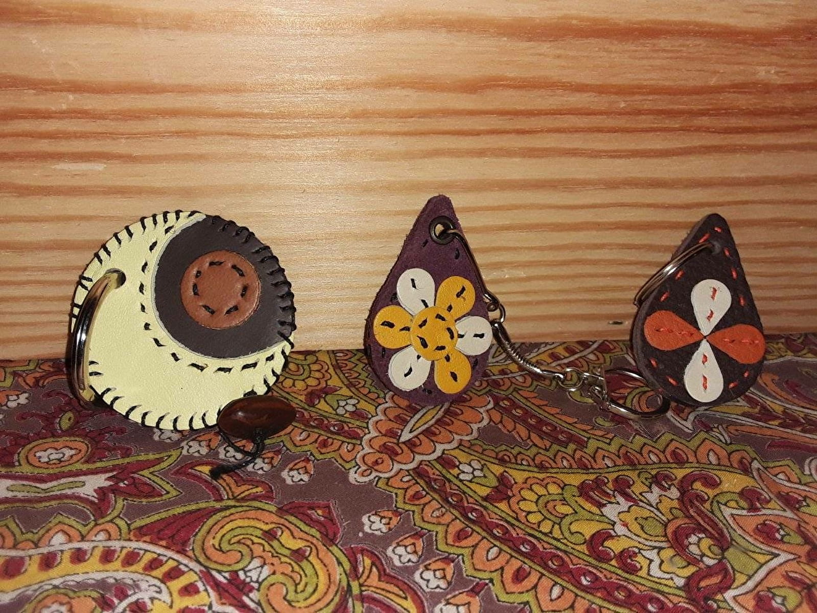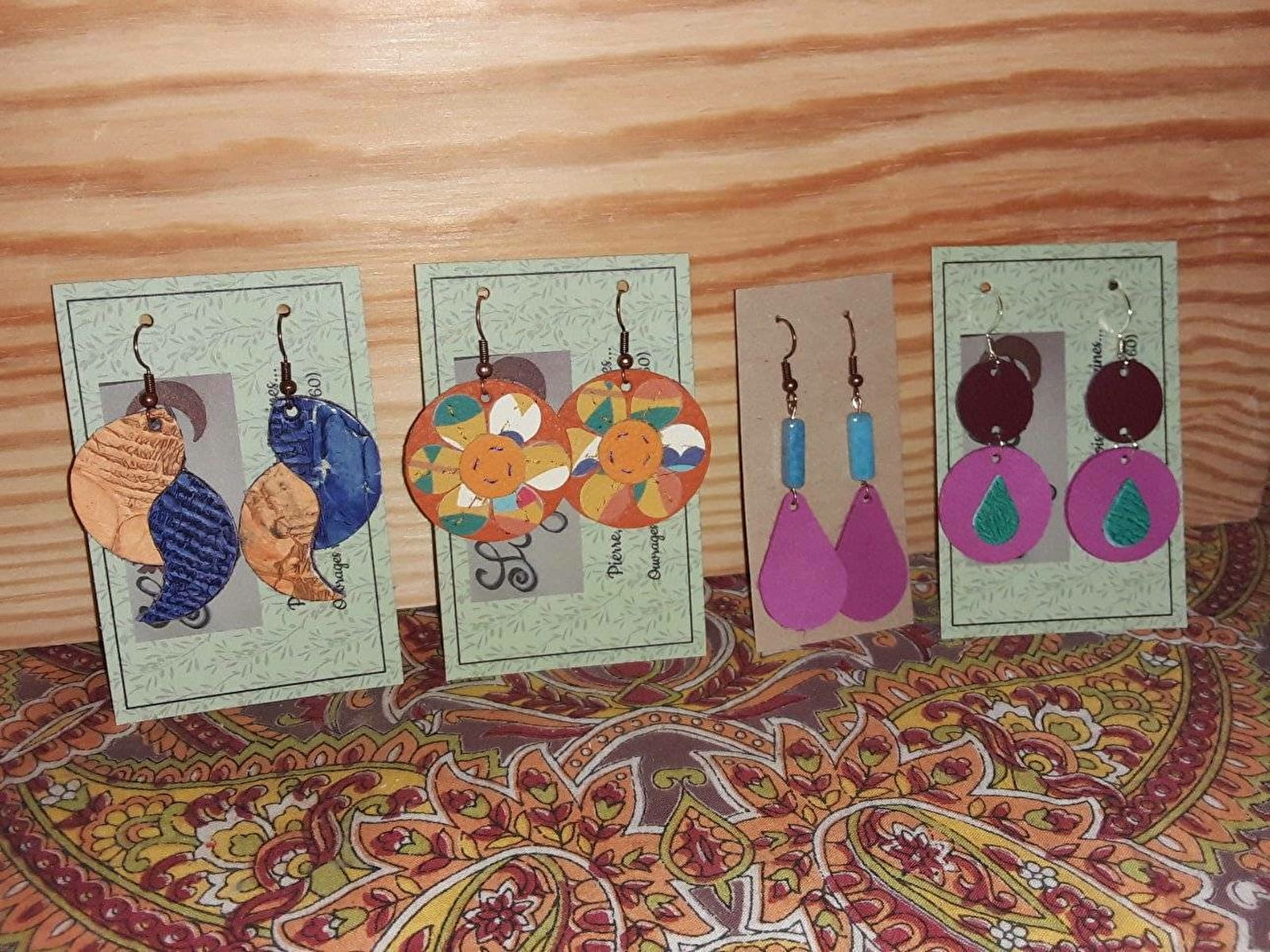 Boucles d'oreilles, colliers, porte-clés... confectionnés à Genouilly, avec des chutes de cuir, de tissu, des plumes ramassées suite aux mues naturelles des oiseaux... mais aussi des perles en bois, en pierres semi-précieuses, des graines...