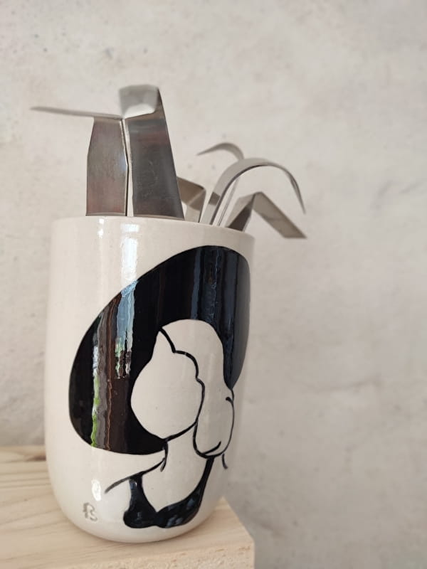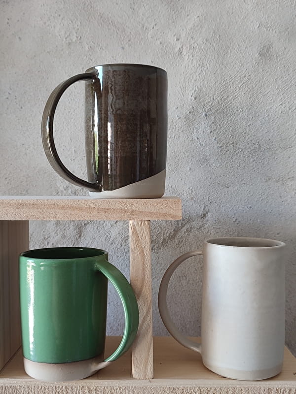 J’observe, j’imagine, je modèle, je teste, je casse, je recycle et je crée des objets de tous les jours. Je réalise chaque pièce à la main, principalement sur mon tour de potier. Chacune est minutieusement façonnée, affinée et émaillée. J’utilise principalement du grès blanc qui cuit à 1250°. C’est une terre solide, idéale pour les poteries à usage culinaire. Mon atelier avec espace boutique, se situe au rez-de-chaussée de ma maison, face aux montagnes du Haut Jura, il vous est ouvert.