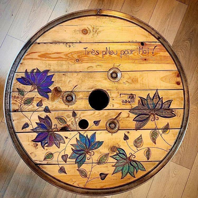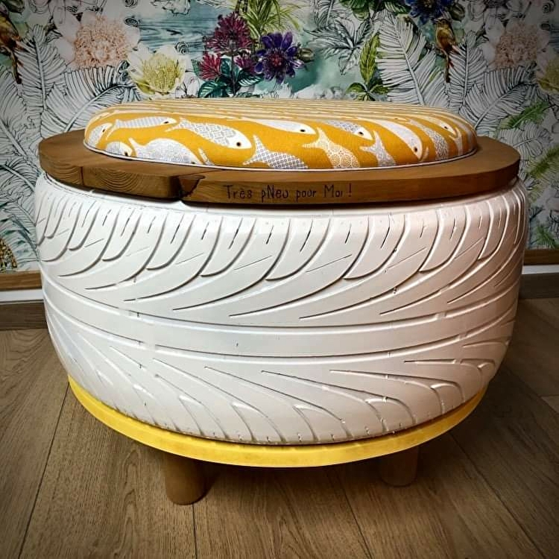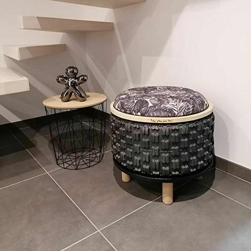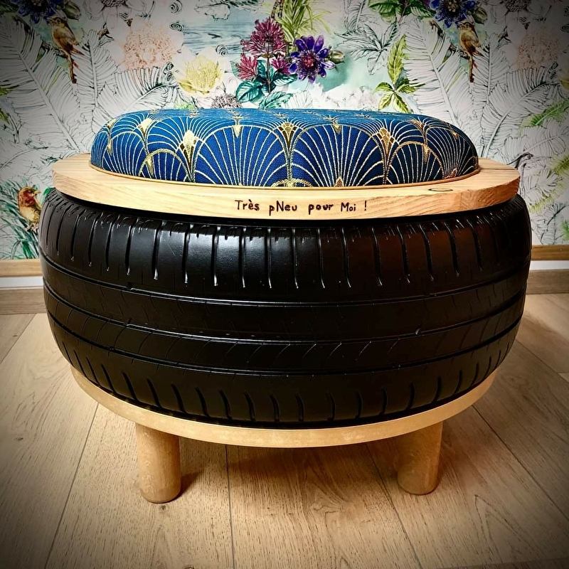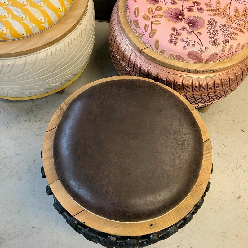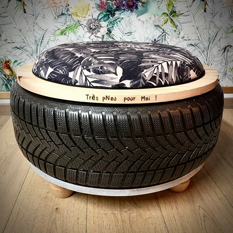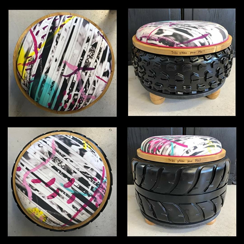 Toujours à fond la gomme, je vous propose des créations plutôt gonflées ! Je confectionne, pour vous et sur mesure, des poufs grâce aux techniques de tapisserie à partir de pneus usagés que je recycle pour les faire entrer dans vos intérieurs ! Vêtus des plus beaux tissus, ils apporteront à votre déco de l'originalité, du chic, du fun, bref tous les styles imaginables ! Mon atelier est ouvert sur une petite boutique d'artisans où vous pourrez découvrir mes créations et celles d'autres talents.
