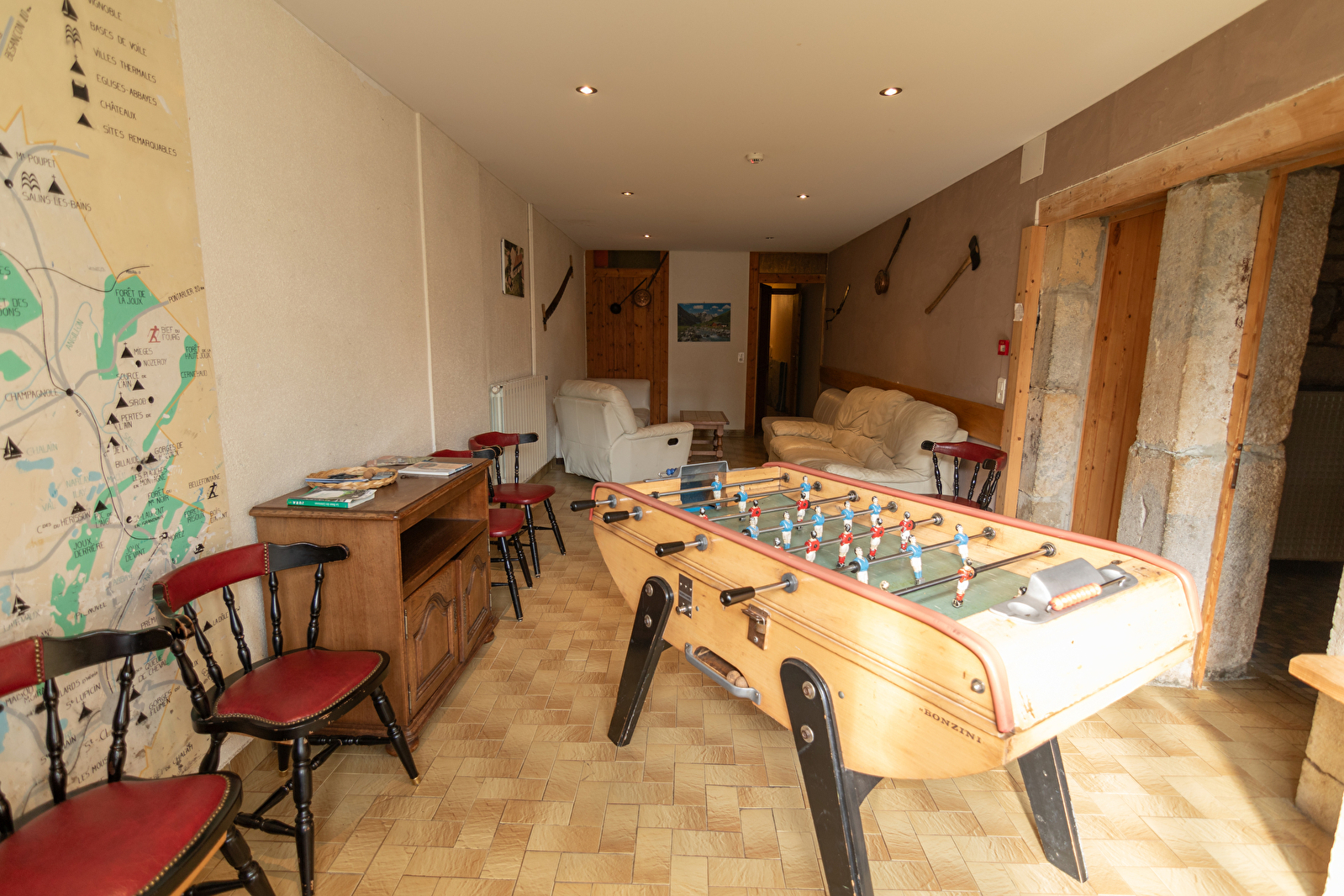 Au rez-de-chaussée de notre gîte, vous pouvez trouver à coté de la salle à manger en pierre apparentes, la salle de détente qui sert également à divers évènements : un baby-foot (gratuit), un coin salon détente (accès à un wifi gratuit). Cette salle peut accueillir 22 personnes pour un séminaire ou pour toute autre occasion.