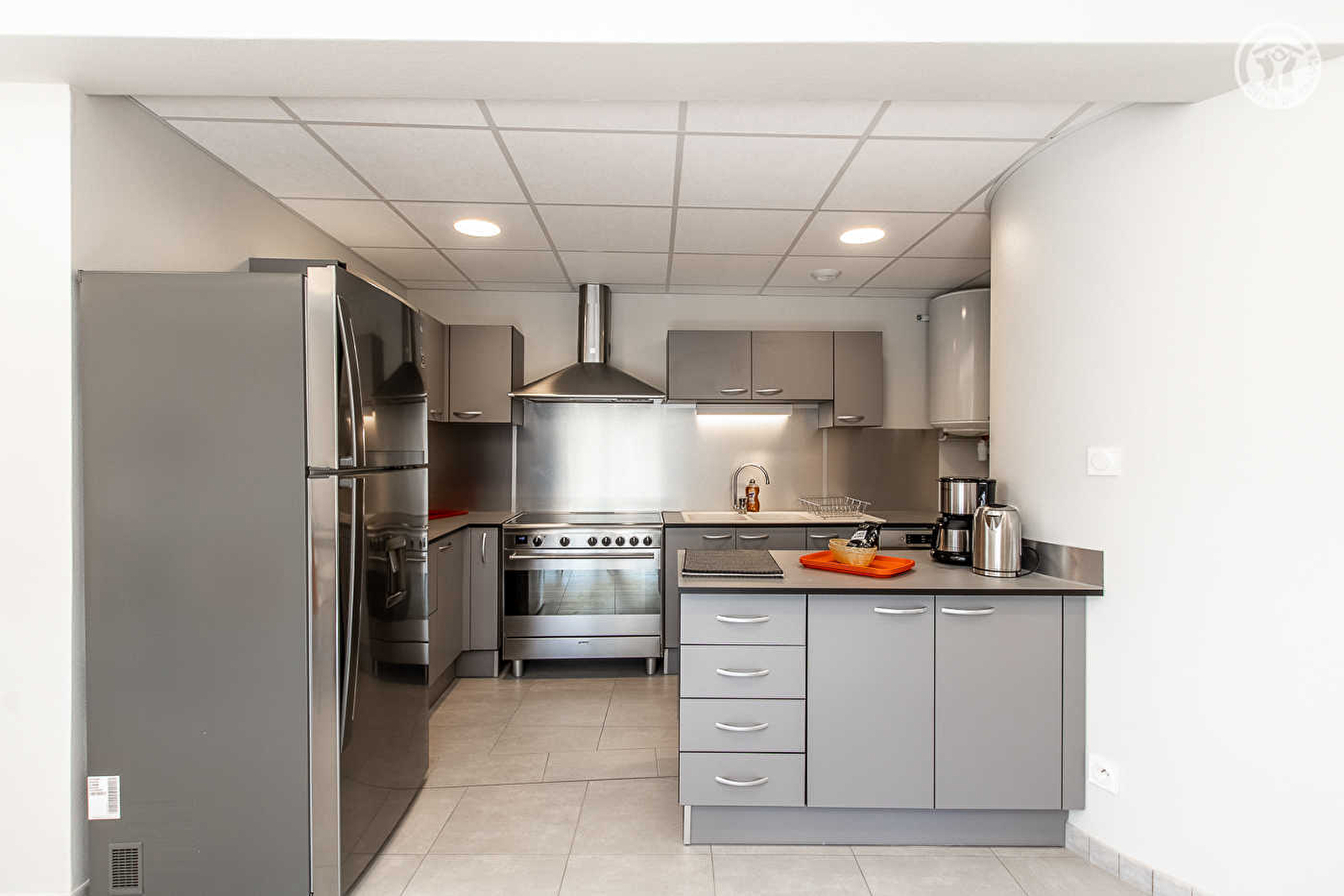 Composition : Maison de village mitoyenne. Wifi. Chauffage PAC. Rdc : Séjour-cuisine-salon, chambre PMR (2 lits 1 p. 80x200cm) avec salle d'eau PMR privative, Wc PMR indépendant, salle de jeux (baby-foot), buanderie. 1er étage (accessible par l'extérieur) : 5 chambres (3 comprenant 2 lits 1 p. 80x200cm / 4 lits 1 p. 80x200cm / 3 lits 1 p. 80x200cm), toutes dotées de salle d'eau privative (douche/Wc). Tous les lits sont jumelables en lit double 2 p. 160x200cm. Balcon-terrasse + local vélos privés. Parking + jardin public sur place. Toutes commodités 5 km.