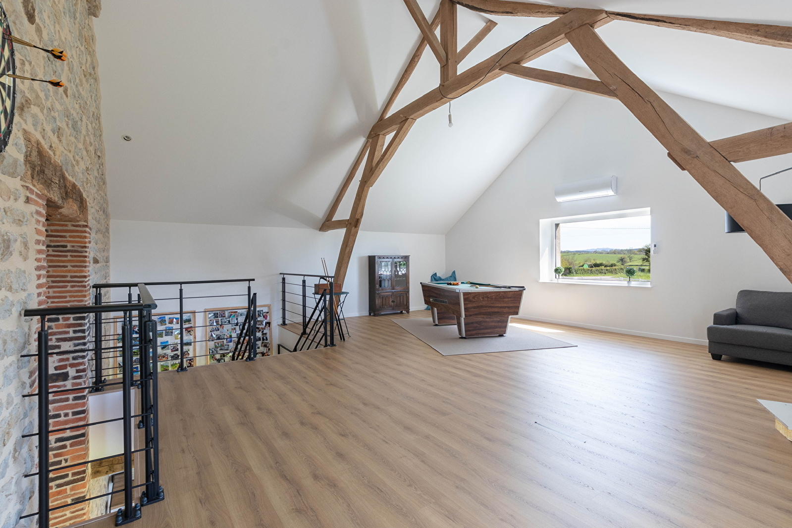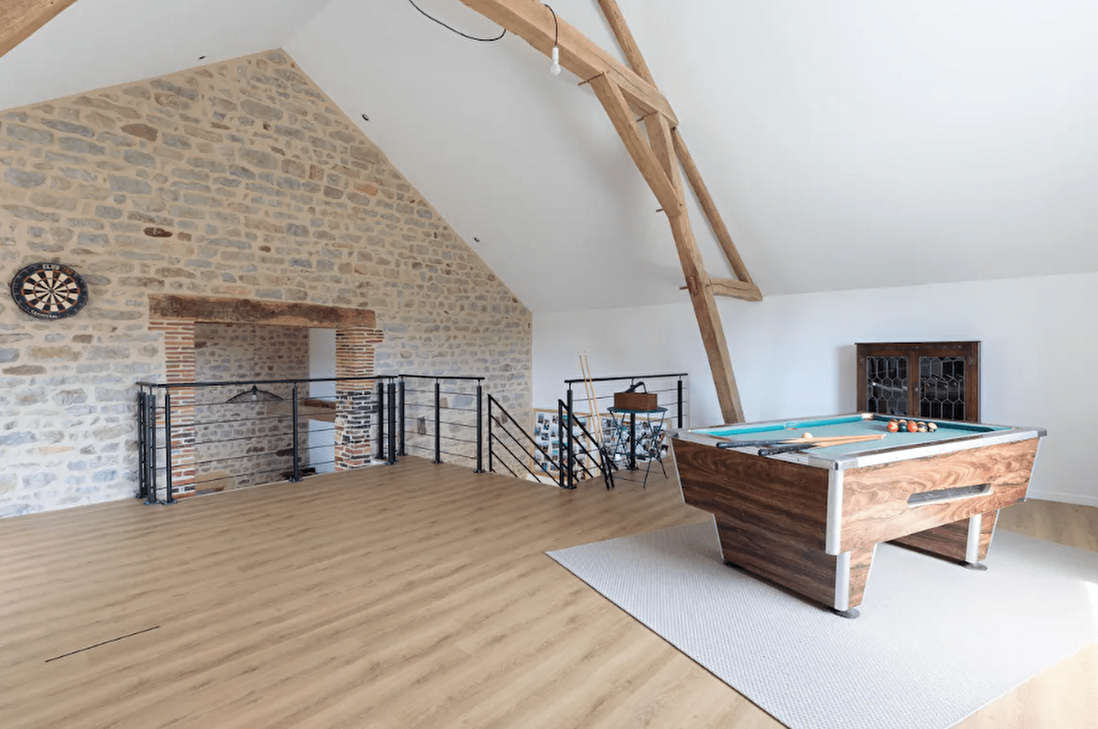 À l'étage, vous trouverez un espace de jeu avec billard, fléchettes et coin lecture, idéal pour la détente. Une chambre double et un dortoir (x8) ainsi qu'une salle de bain et un WC séparé, viennent compléter cet étage.
